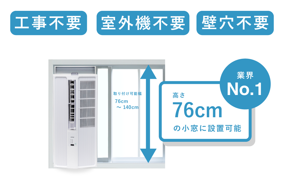 窓用エアコンの最大の特徴は設置の手軽さ。工事不要で窓枠にはめ込むだけで使用することができます。CAZALiシリーズは高さ76cmの小窓でも設置することが可能で最小取付可能幅は業界No.1です。(2026年3月時点)