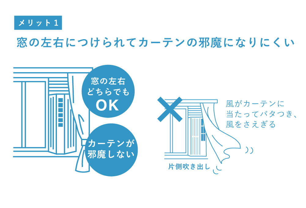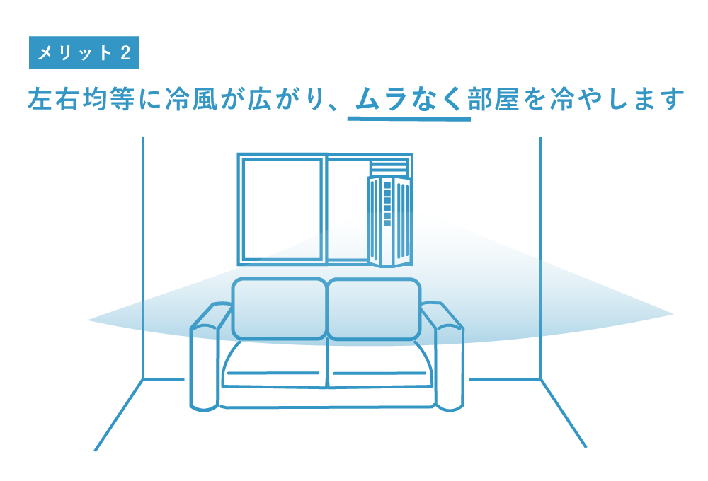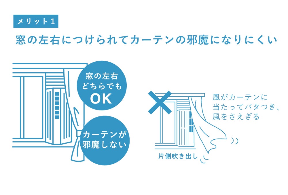 従来の片側吹き出しタイプでは、冷風がカーテンに当たってバタつきや風遮りが起こりがちでしたが、センター吹き出しならカーテンに干渉せずスムーズに風を届けます。さらに、左右どちらの窓枠にも取り付けられるため、設置場所を選ばずレイアウトの自由度が高まります。さらにセンター吹き出しは、本体中央から風を送り出すため左右へ均等に広がり、室内の空気をムラなく循環させます。