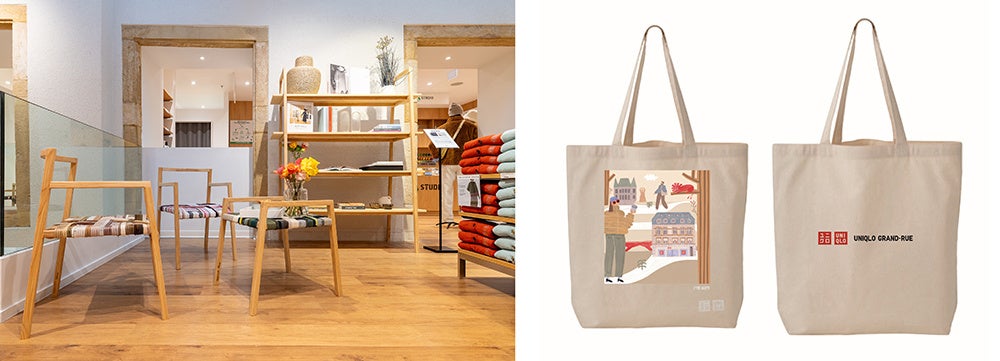 また、家具デザイナー ジュリー・コンラッド氏とのコラボレーションも見どころの一つです。コンラッド氏は、リサイクル素材を活用したデザインで知られ、機能性と美しさを兼ね備えた作品を、物語性のあるアプローチで制作しています、ユニクロ グラン・リュ店では、読書コーナーのデザインに加え、店内に設置される椅子のデザインも手がけました。大工のノルベルト・ブラコニエ氏と共同制作されたこの椅子は、シンプルな木製のフレームと組み合わされる座面に、「RE.UNIQLO」の取り組みの一環として、お客様から回収した服を編んだ布地を使用しています。