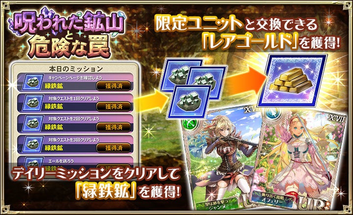 “呪われた鉱山と危険な罠”は、デイリーミッションで獲得したイベントアイテム「緑鉄鉱」を使用する事で、特別クエストが解放され、オフェリーとジャンヌが“呪われた鉱山”で発生したトラブルを解決するために奮闘するスペシャルシナリオが楽しめます。