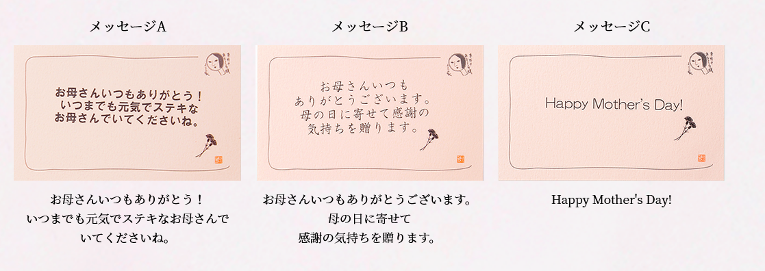 ご希望の方には、3種類から選べる母の日仕様のメッセージカードをお付けいたします。