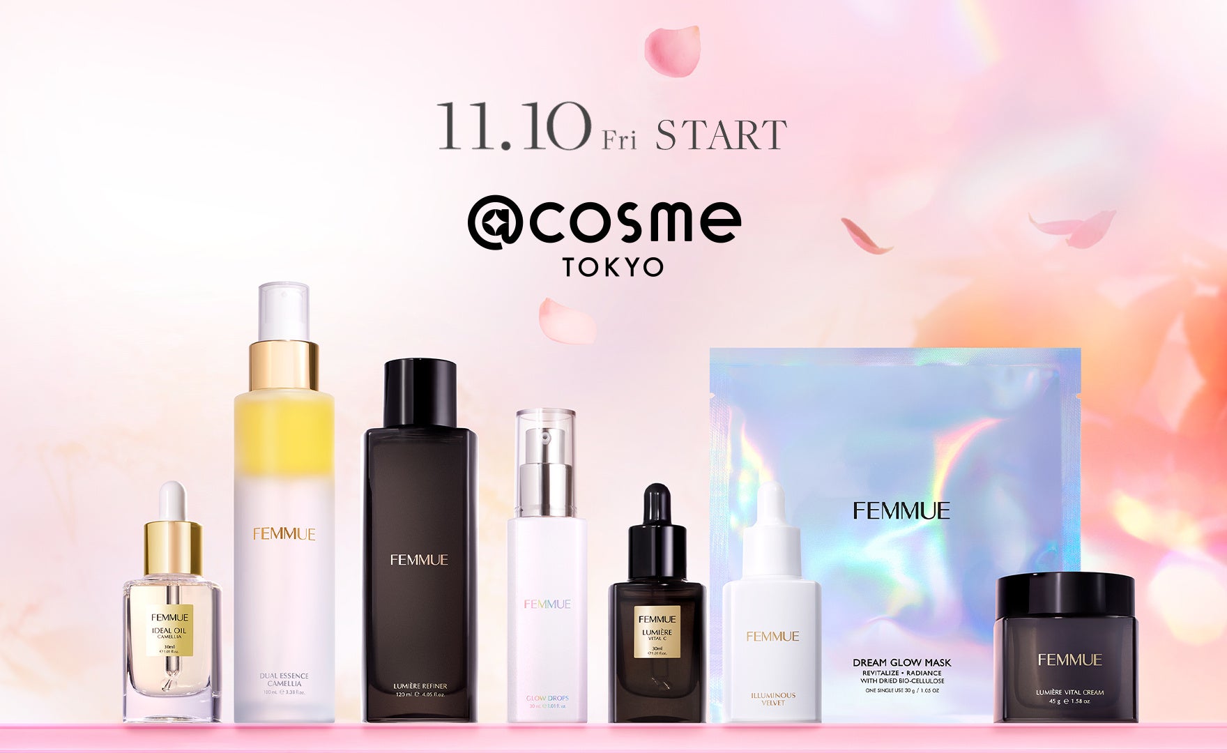 @cosme TOKYOでは、FEMMUEの大人気製品「ドリームグロウマスク」「ルミエール ヴァイタルC」から、話題の新製品「グロウドロップス」、2023年ホリデーコレクションなど幅広いラインナップを展開。