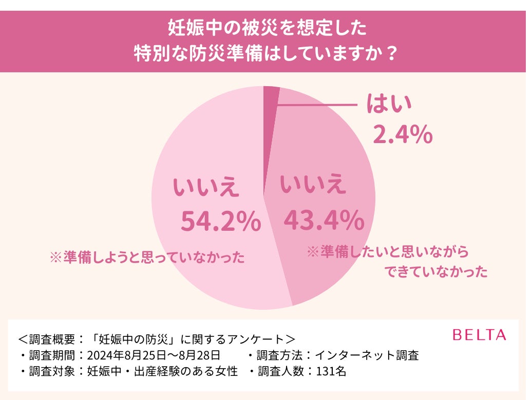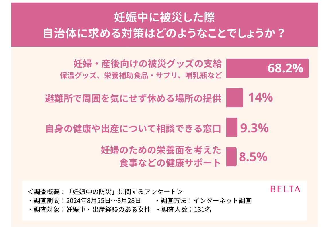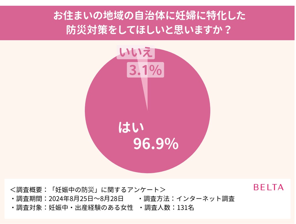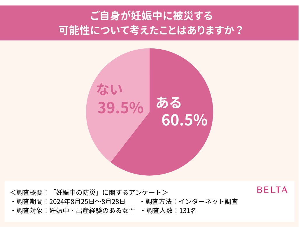株式会社ベルタ(本社:東京都港区)が運営する女性ライフステージブランドBELTAは、9月の「防災月間」に向けて、妊娠経験のある131名を対象に「妊娠中の防災」に関するアンケートを実施いたしました。アンケート結果から、妊娠中の女性たちが抱える災害に対する不安、自治体に望む防災対策が見えてきました。