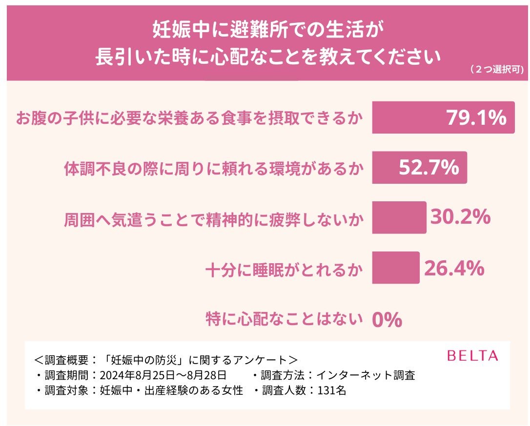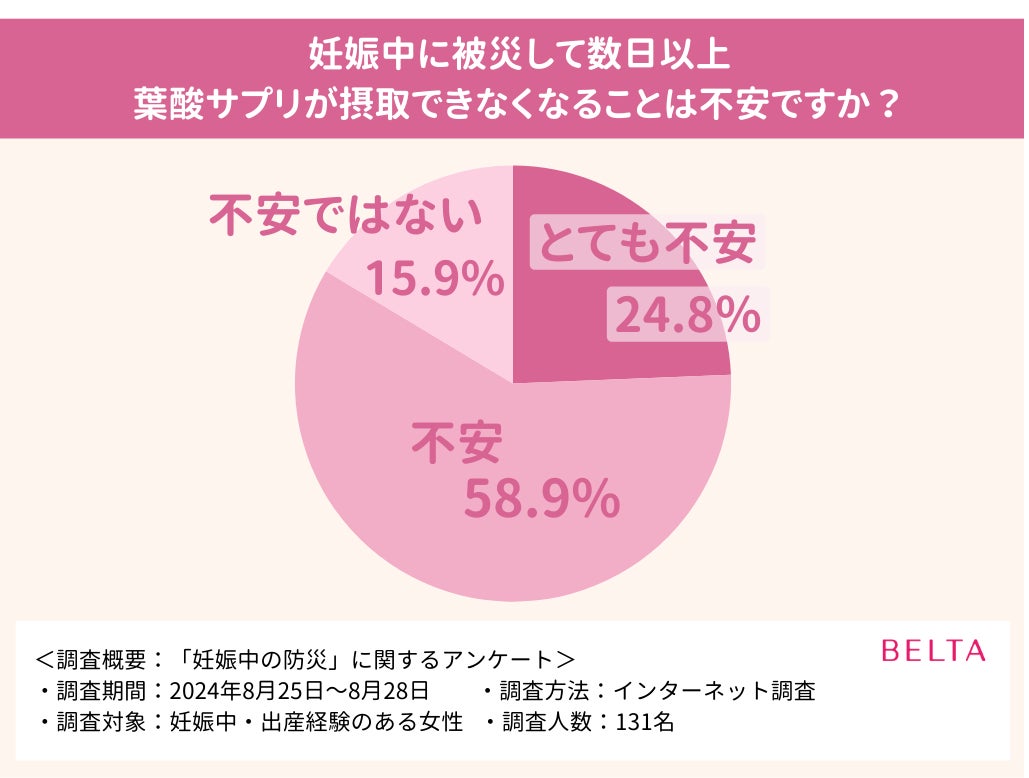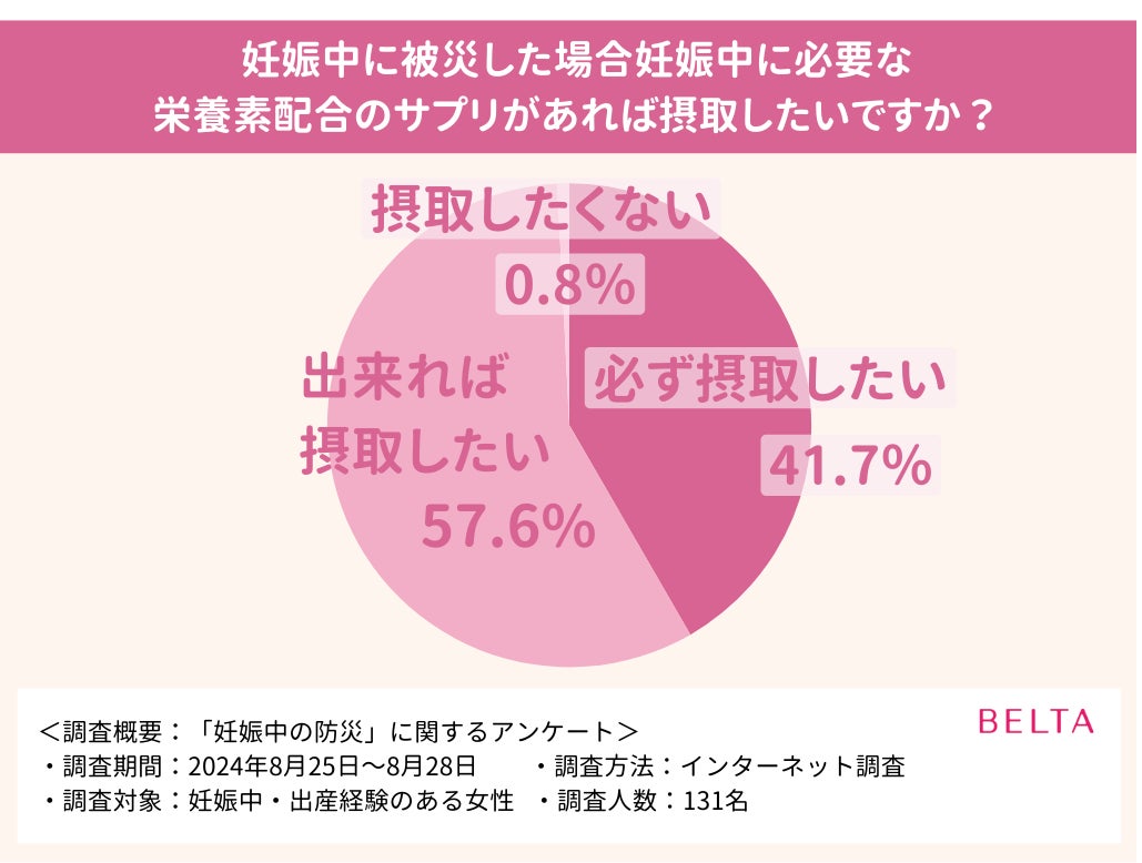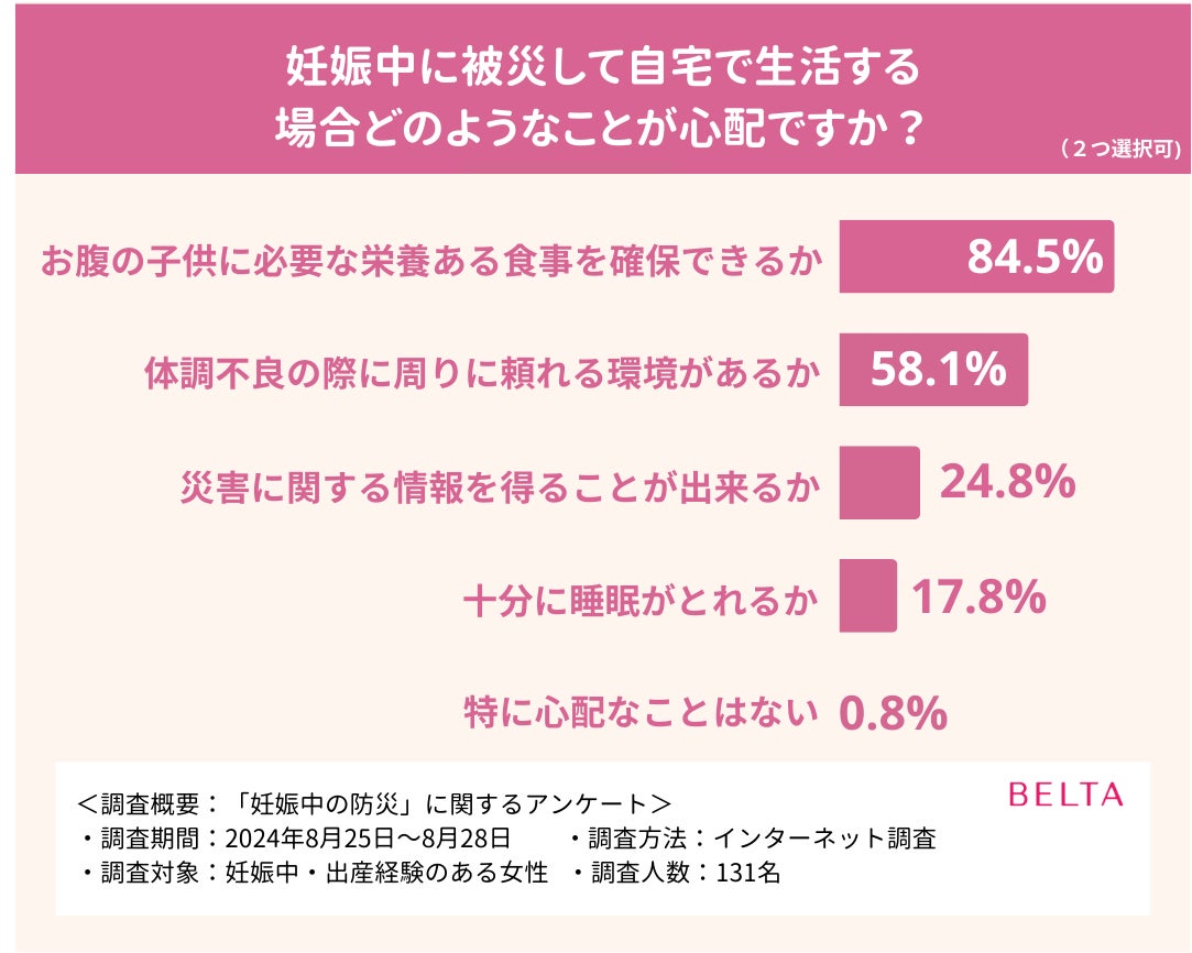 株式会社ベルタ(本社:東京都港区)が運営する女性ライフステージブランドBELTAは、9月の「防災月間」に向けて、妊娠経験のある131名を対象に「妊娠中の防災」に関するアンケートを実施いたしました。アンケート結果から、妊娠中の女性たちが抱える災害に対する不安、自治体に望む防災対策が見えてきました。