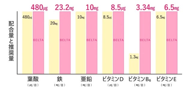 妊娠中に摂取するべき栄養素(厚生労働省推奨量とベルタ葉酸サプリの成分配合量)