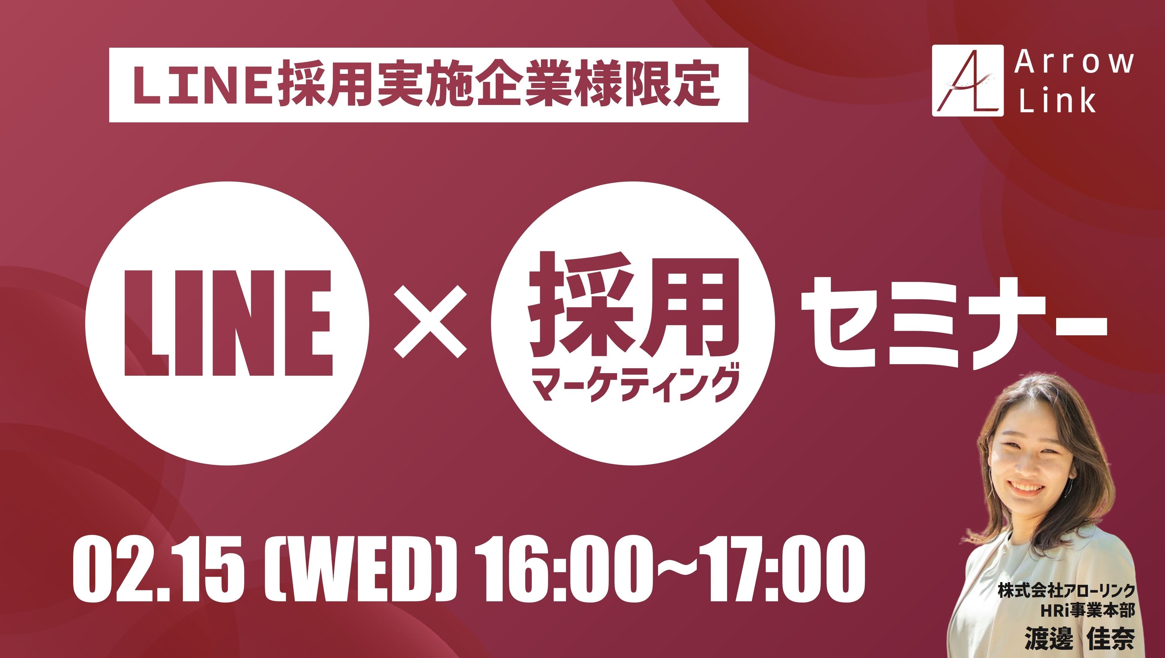 株式会社アローリンク(本社:兵庫県神戸市、代表取締役:蓬莱和真)は、2/15(水)にLINE採用実施企業様限定のオンラインセミナーを無料で開催します。「新採用戦略・即実践・LINE×採用マーケティング セミナー」と題し、コロナ禍に最適な"LINEを活用した採用戦略"について詳しくお伝えします。