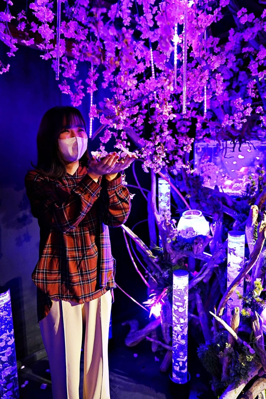 奈良金魚ミュージアムでは、年に4回季節ごとに装飾の変更を行っています。本企画では桜の花言葉「精神美」に準え、その美しさや切なさ、生命力の力強さなどを幻想的な空間と、希少とされる真っ白な「土佐錦」の展示で表現しました。
