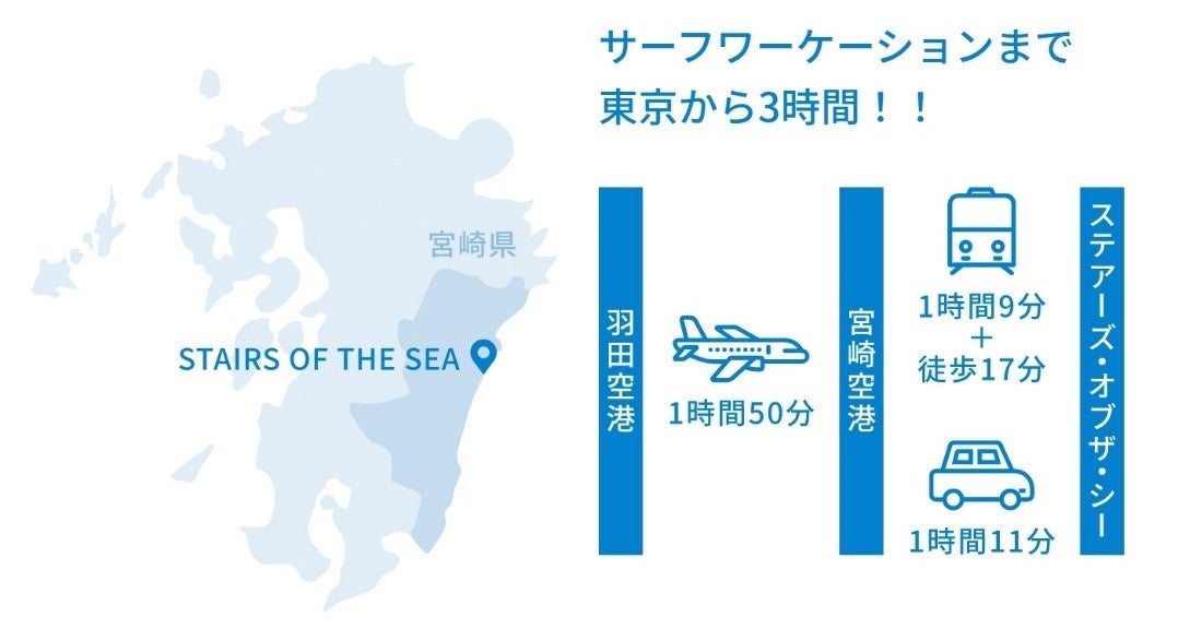 ヤシの木が立ち並ぶ宮崎の海まで、東京からたったの3時間。宮崎空港からのアクセスも、海沿いを通るので爽快です。