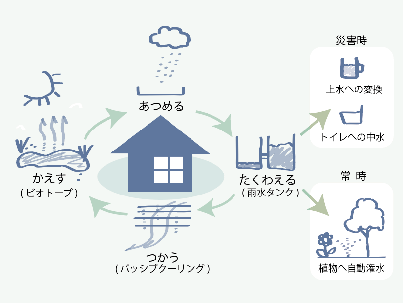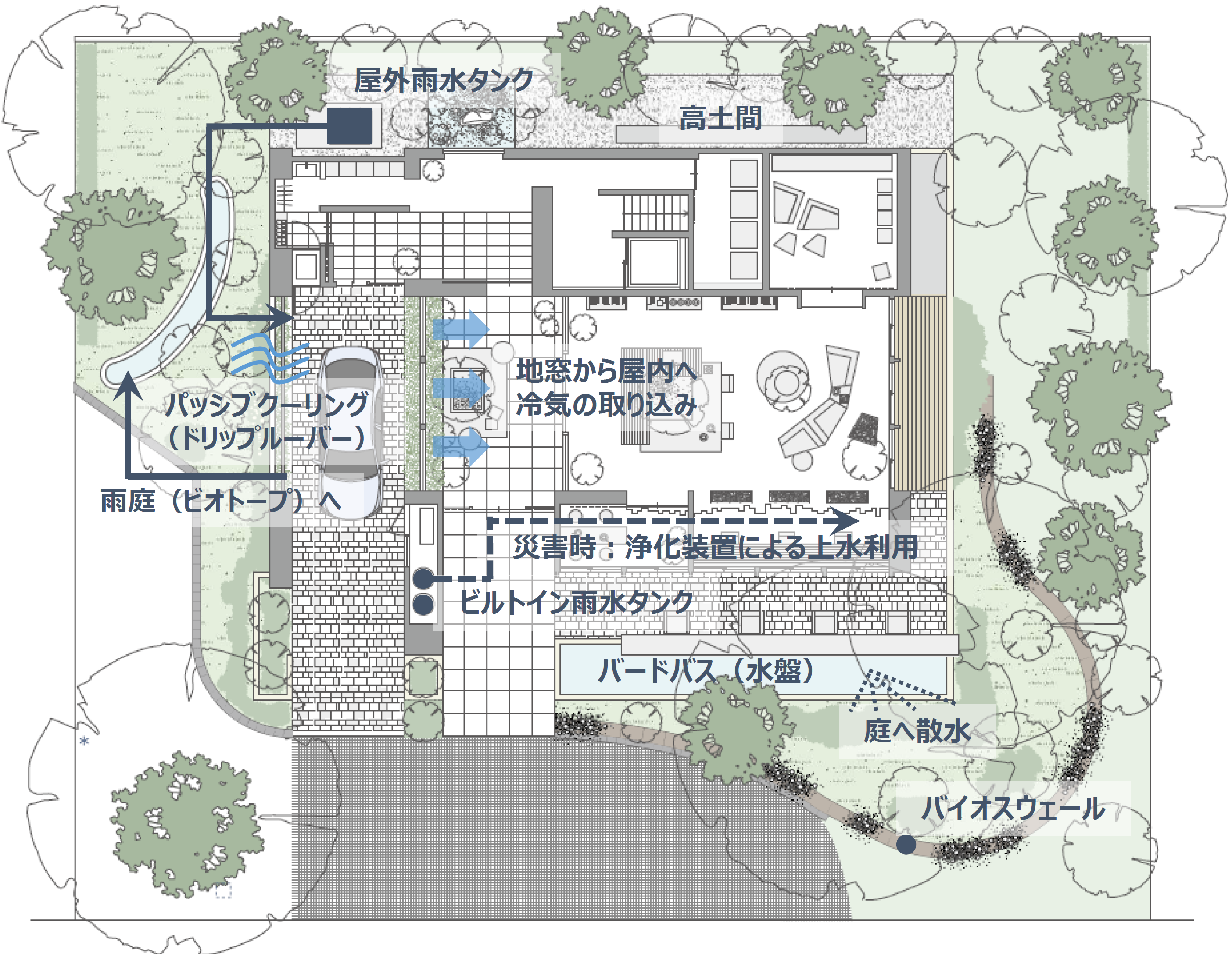 【雨水の循環デザインと雨水を活用した外構計画のイメージ】
