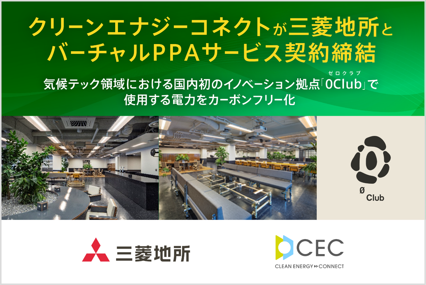 脱炭素経営企業、RE100参加企業等のお客様に対してNon-FIT太陽光発電によるグリーン電力と環境価値をお届けする株式会社クリーンエナジーコネクト(代表取締役:内田鉄平、以下「クリーンエナジーコネクト」)は、三菱地所株式会社(以下「三菱地所」)とバーチャルPPAサービス契約を締結し、三菱地所が2024年10月に開業した国内初の気候テックに特化したイノベーション拠点 「0 Club(ゼロクラブ)」(東京都千代田区大手町2-2-1 新大手町ビル内)で使用する電力を、バーチャルPPAサービスによりカーボンフリー化する取り組みを開始したことをお知らせいたします。