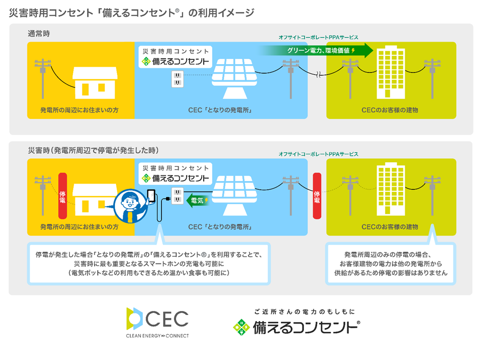 今回開発するNon-FIT太陽光発電所には、発電所の設置地域で災害等により停電が発生した際、周辺にお住まいの地域住民の皆さまが太陽光発電で発電した電気を利用できる災害時用コンセント「備えるコンセント®」を導入しており、これにより、発電所の設置地域に対するレジリエンス向上に貢献することを目指します。