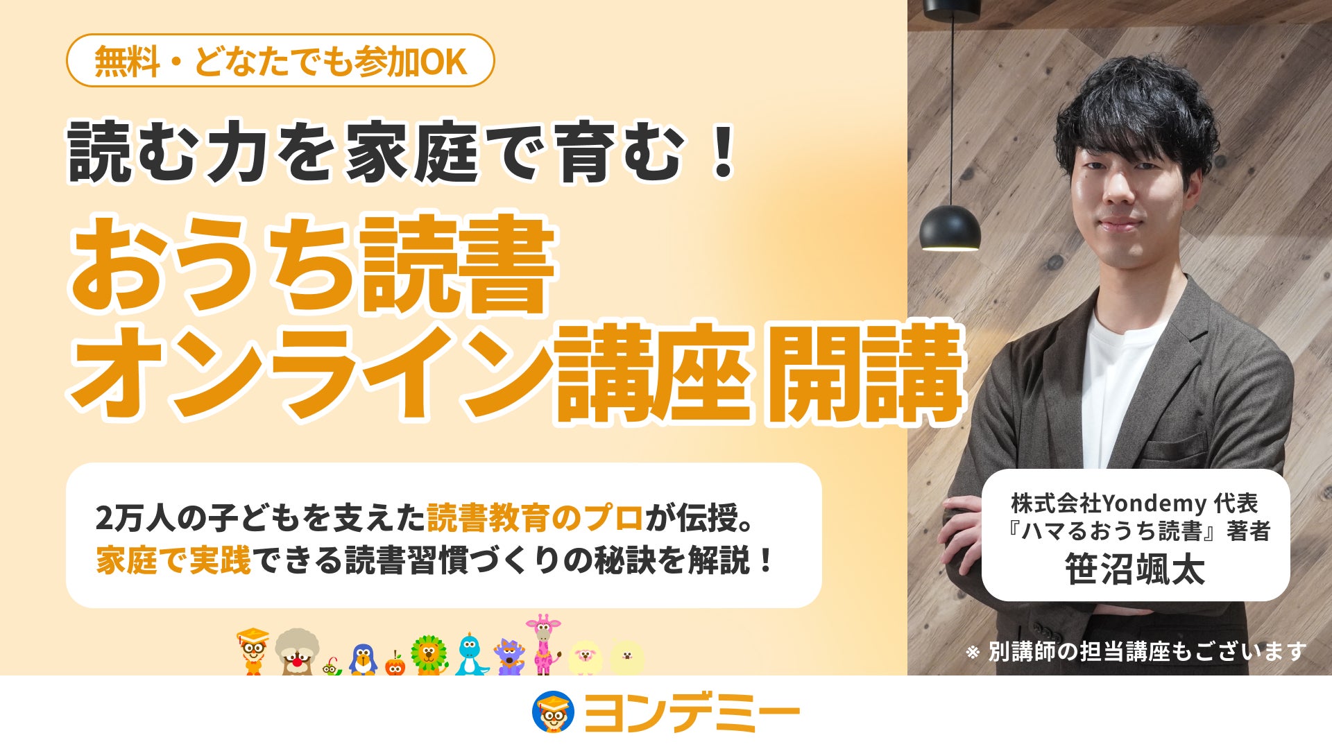 子どもが読書にハマるオンライン習い事「ヨンデミー」を運営する株式会社Yondemy(本社:東京都中央区、代表取締役:笹沼 颯太)は、家庭で“読む力”の土台を育てるための完全無料オンラインウェビナー「おうち読書オンライン講座」を新たに開始します。