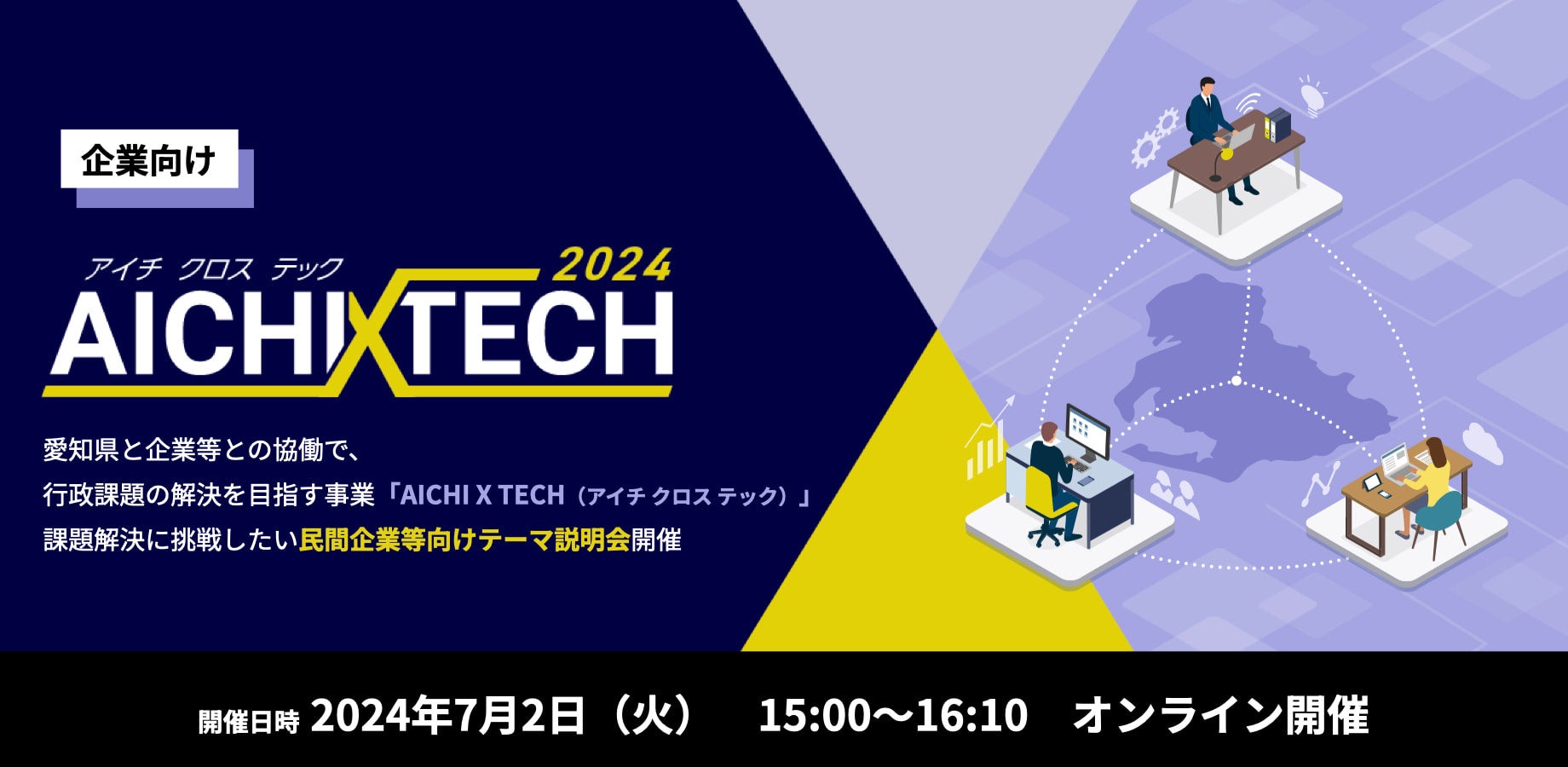 愛知県では、ICT利活用やDX推進の今後の展開の指針である「あいちDX推進プラン2025後半の取組」(2023年12月策定)に基づき、県のデジタル化・DXを迅速かつ計画的に進めています。この一環として、県庁内の各所属が抱える行政課題の解決を図るため、ICTを活用した解決策を有する企業等を募集・マッチングし、課題解決に向けた実証実験を行うICT活用課題解決支援事業(愛称:「AICHI X TECH」)を2022 年度から実施しています。全国からたくさんのご参加・ご応募をお待ちしています。