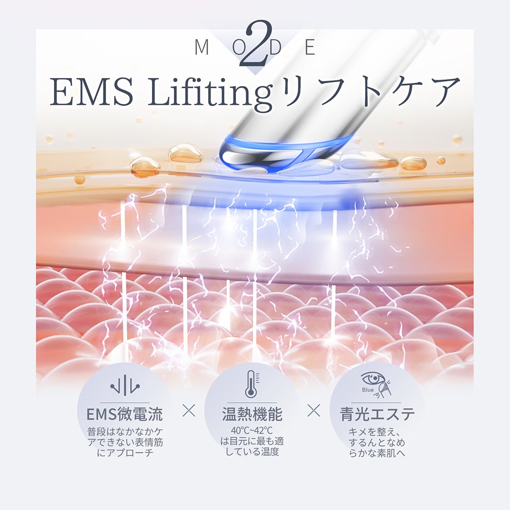 【2色LED&モード】①赤色LED+温熱+微振動+イオン導入、②青色LED+温熱+EMSをご利用できます。従来の目元美顔器より振動回転数や光エステやヘッドの部分をUPしました。