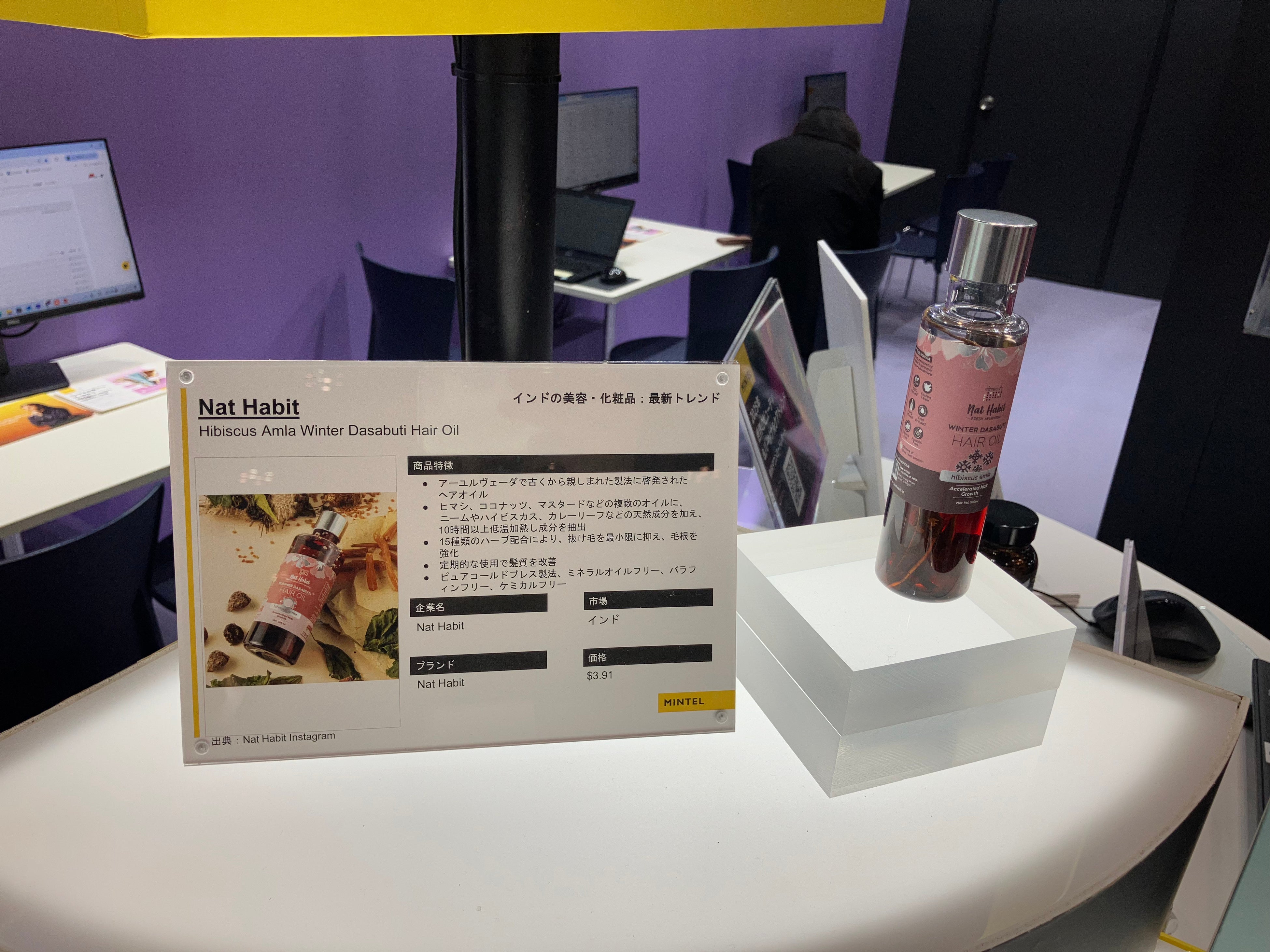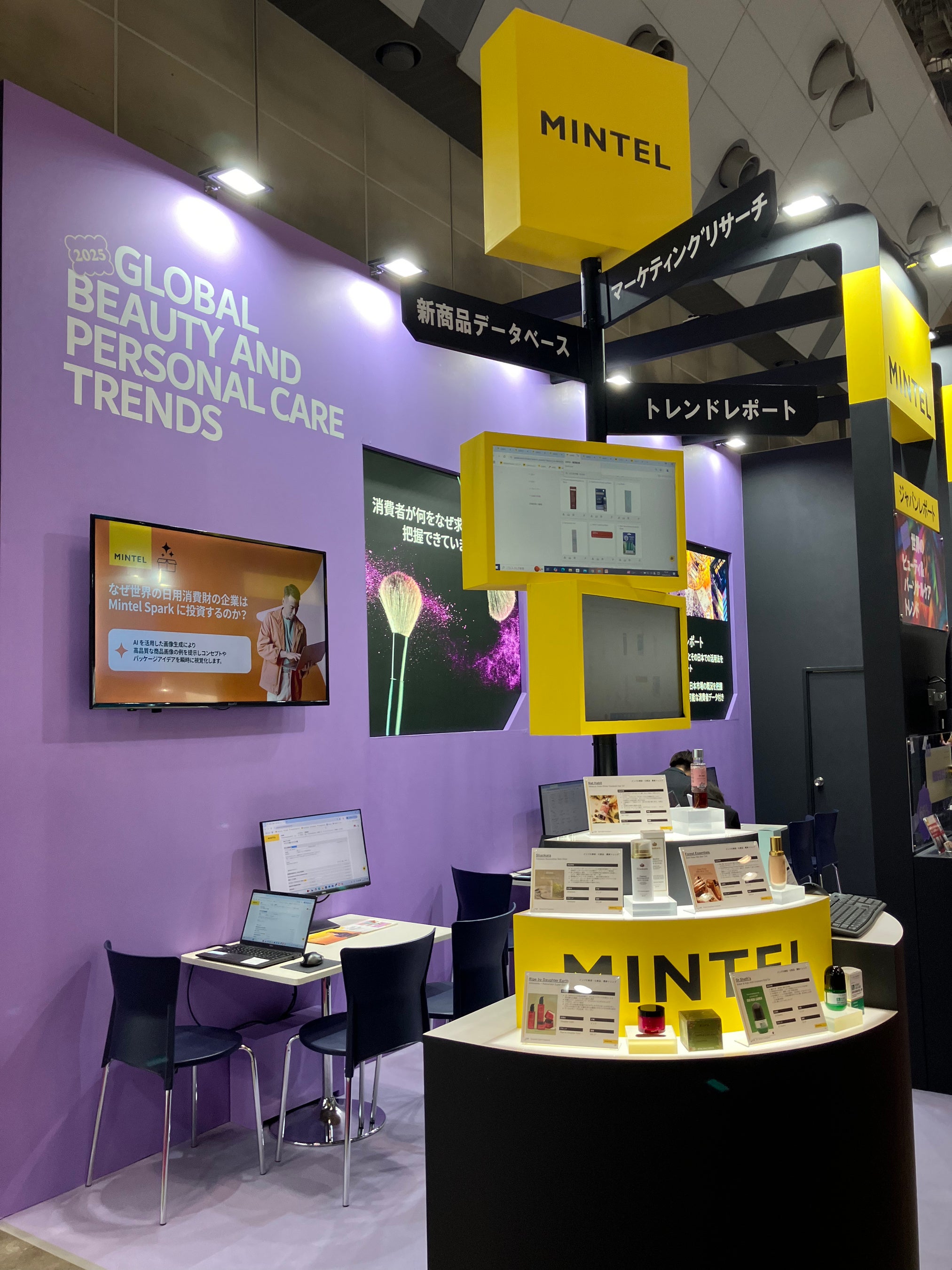 ブースでは、講演者のターニャが本展示会のためにピックアップした「インドの美容・化粧品」およびミンテルの「2025:世界のビューティ&パーソナルケアトレンド」レポートに掲載している海外製品を展示しました。ご興味のある方は、ぜひミンテルジャパンまでお問い合わせください。