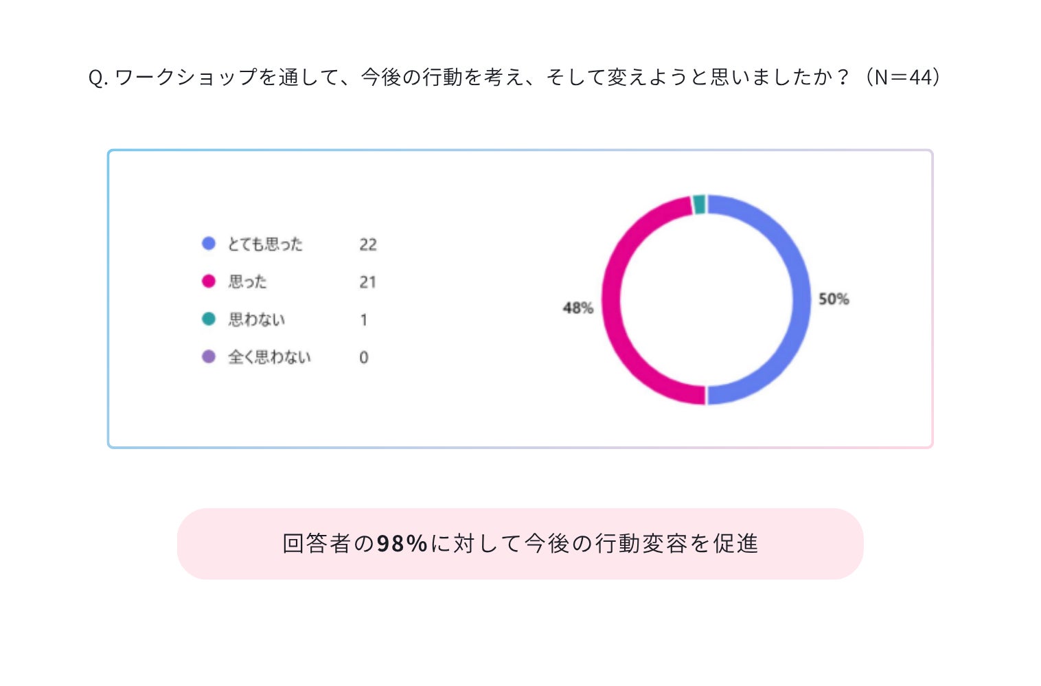 「今後の行動を考え、そして変えようと思いましたか?」という質問には、98%が「とても思った」「思った」と回答し、ワークショップを通して、今後の行動変容が促進できました。