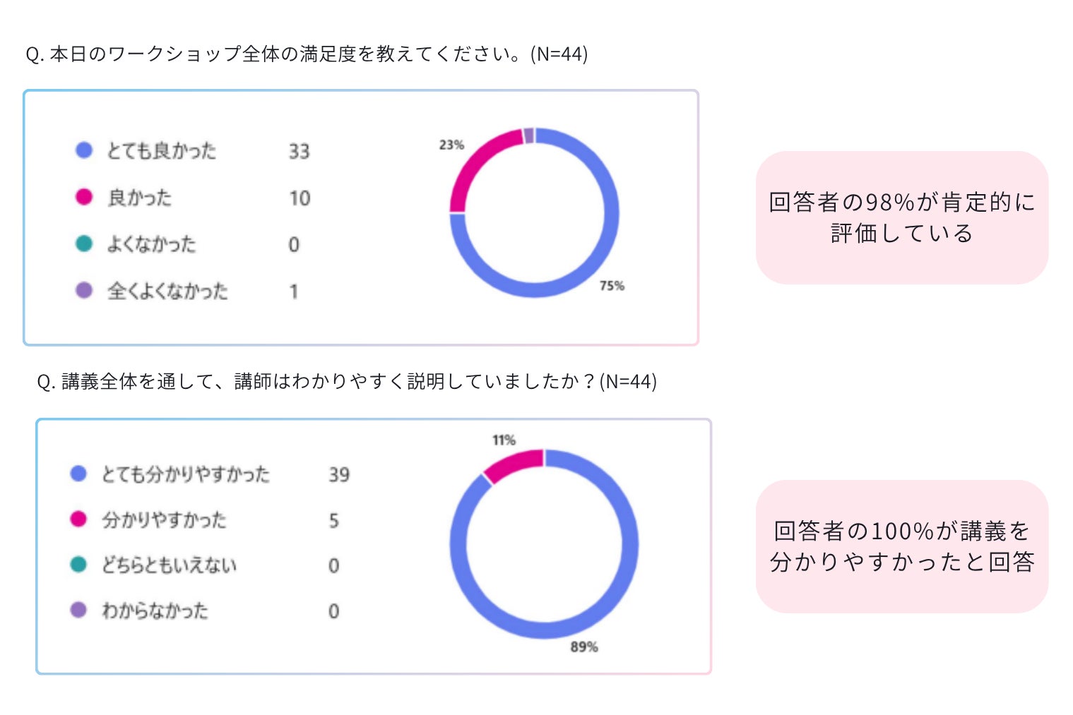 ワークショップ実施後の参加者アンケートでは、98%が「良かった」「とても良かった」と回答し、講師の説明は100%が分かりやすかったと評価しました。