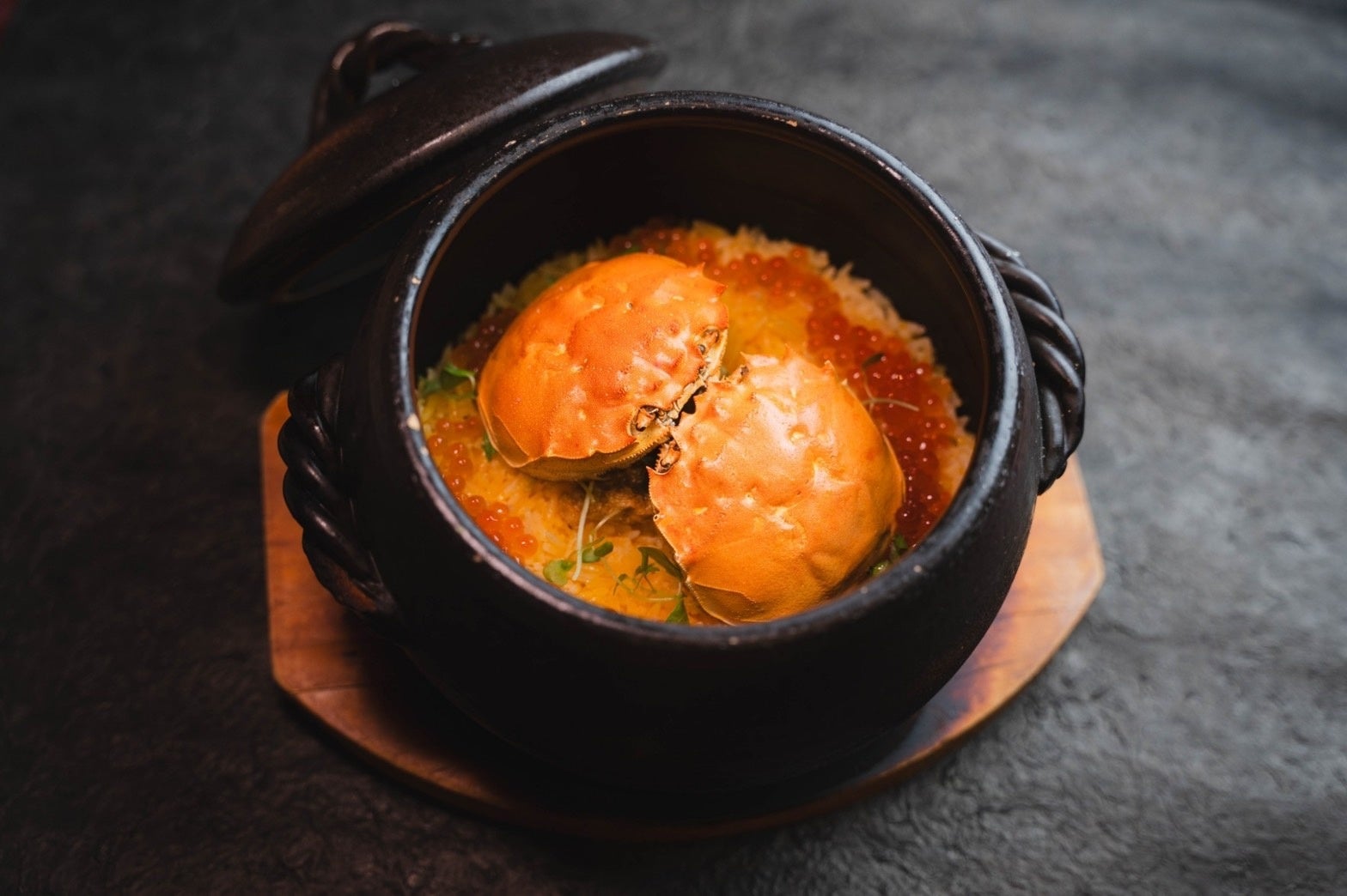 上海蟹のみそと身、出汁で炊いた豪華な土鍋ご飯。