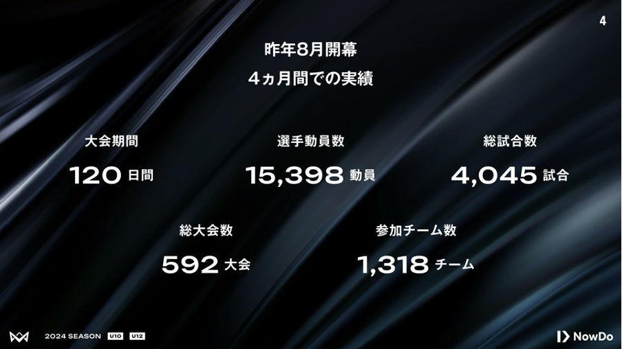Now Do株式会社 取締役副社長 鈴木良介より大会初年度の実績について説明いたしました。2023年8月に開幕した【4v4】は4ヶ月間で592大会が行われ、15,398人、1,318チームが参加しました。