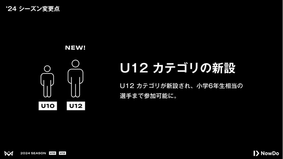 小学4年生相当のU10カテゴリに加え、U12カテゴリが新設され、小学6年生相当の選手まで参加可能となります。さらに、昨年度まで6人までとしていたメンバー登録が、1チームに7人まで登録可能となります(ただし大会にエントリーできるのは6人までとなりますのでご注意ください)。