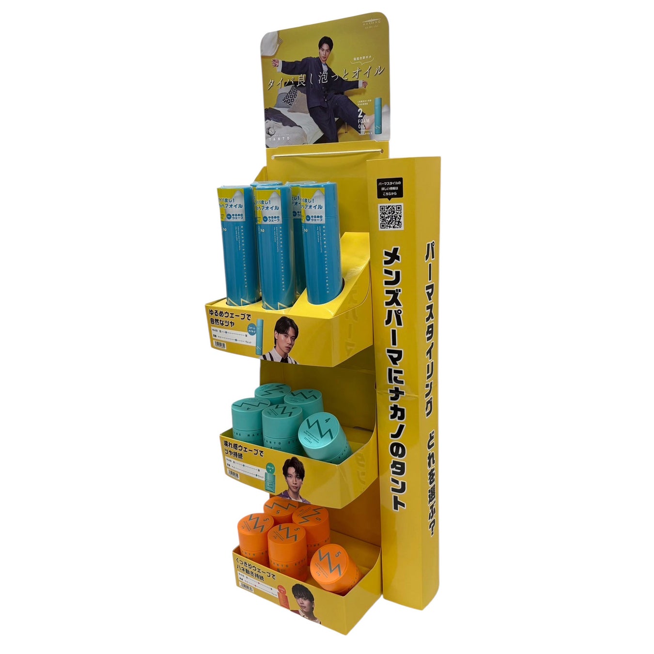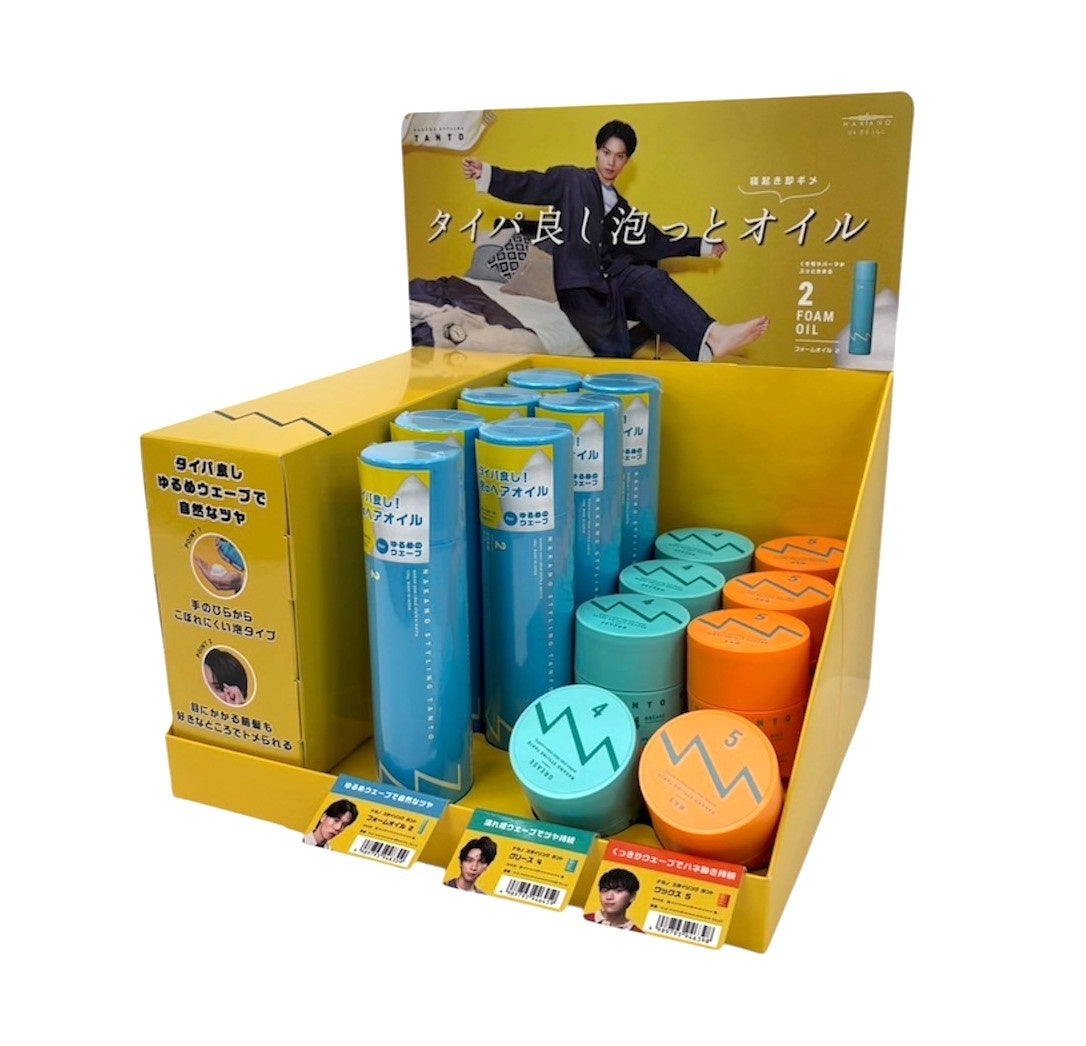 メンズパーマスタイリングに最適な3アイテム用のオリジナル什器を展開すると共に、「タント」計12アイテム販売什器も一新。スタイルごとのアイテムの違いを明確に訴求することで、自分らしい“なりたい姿”に合ったアイテム選定のサポートを強化します。