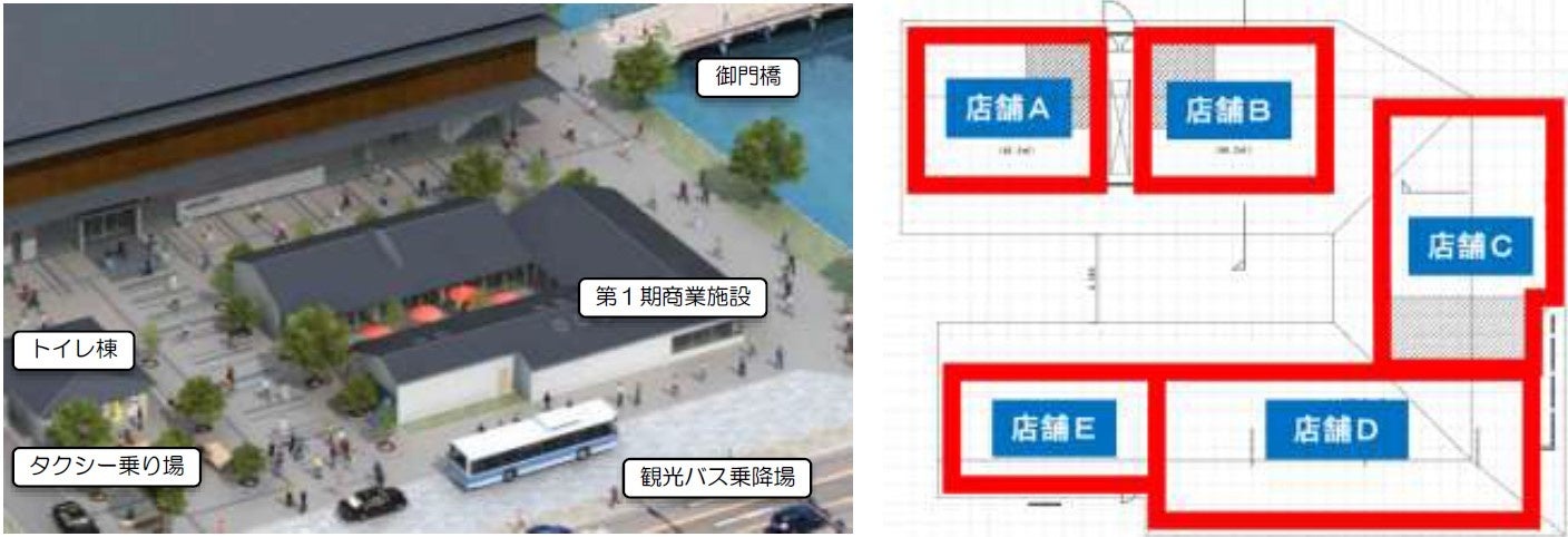 広島城二の丸から御門橋でつながる敷地には、和の意匠を随所に取り入れた商業施設や、サクラ・モミジなど四季折々に表情を変える木々、テーブルとベンチ、トイレ棟を備えたくつろぎの広場がひろがります。また、平面駐車場や観光バス乗降場、タクシー乗り場も整備し、さらに近隣のひろしまゲートパークやひろしまスタジアムパークとペデストリアンデッキでつながることにより、回遊性向上が期待できます。