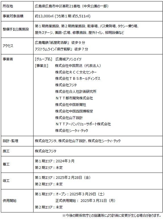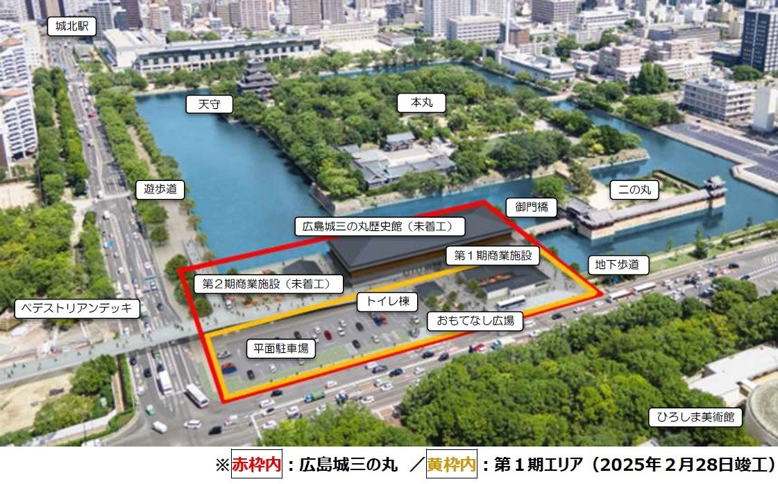 広島城アソシエイツ(代表法人である中国放送を含む11社の共同事業体)が取り組む広島城三の丸整備等事業(Park‐PFI事業)において、2025年3月末に供用開始する第1期エリアが竣工しました。