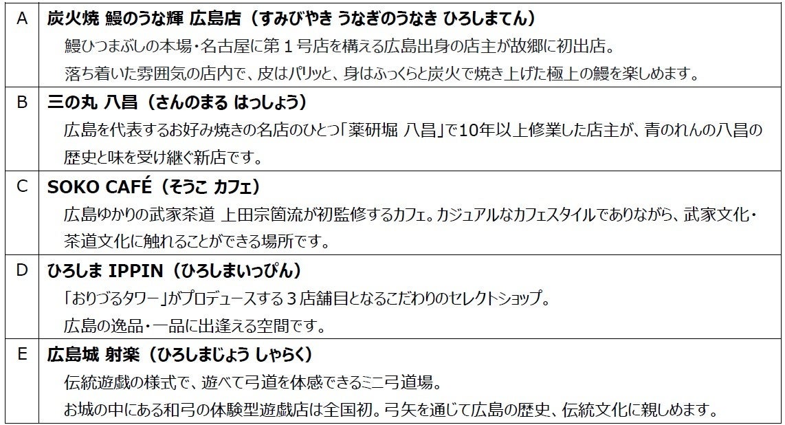 広島城天守を間近に感じながら、食べる、遊ぶ、学ぶ、歩く、憩う・・・思い思いに広島の歴史と文化に触れることができるエリアです。
