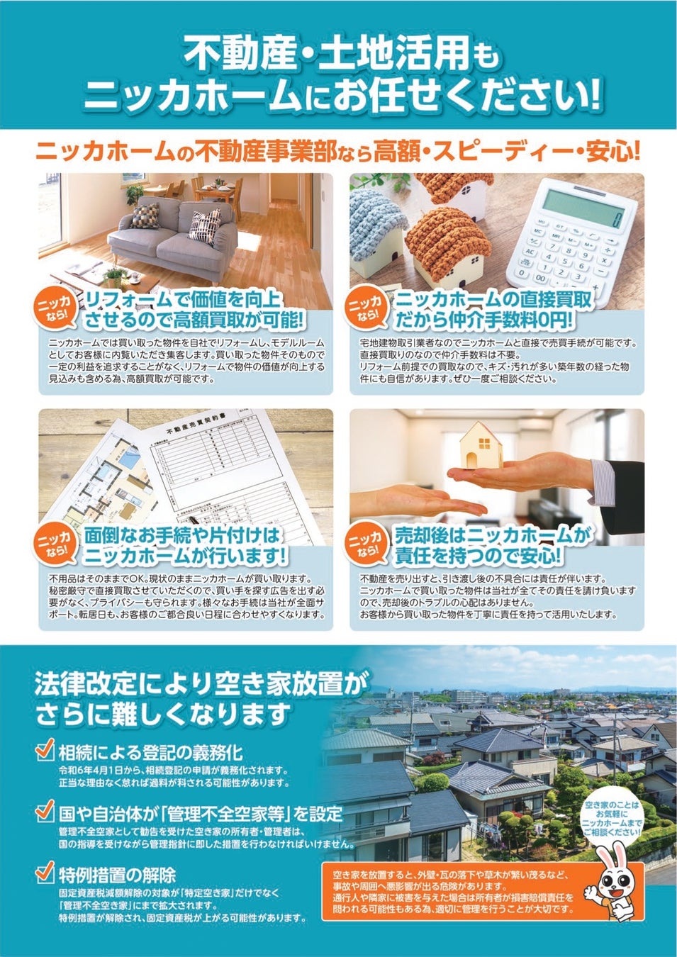 住まいのトータルサポートのニッカホームが、様々な不動産活用をご提案します!昨今度々取り沙汰されている「空き家問題」を、ニッカホームが解決します!