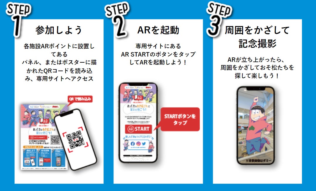 Gugenka制作のおそ松さんのモデルデータを活用し、今回のイベント用に新規アニメーション制作。各施設のARポイントに設置してあるパネルやポスターにスマートフォンをかざすだけで手軽にARおそ松さんをお楽しみいただけます。