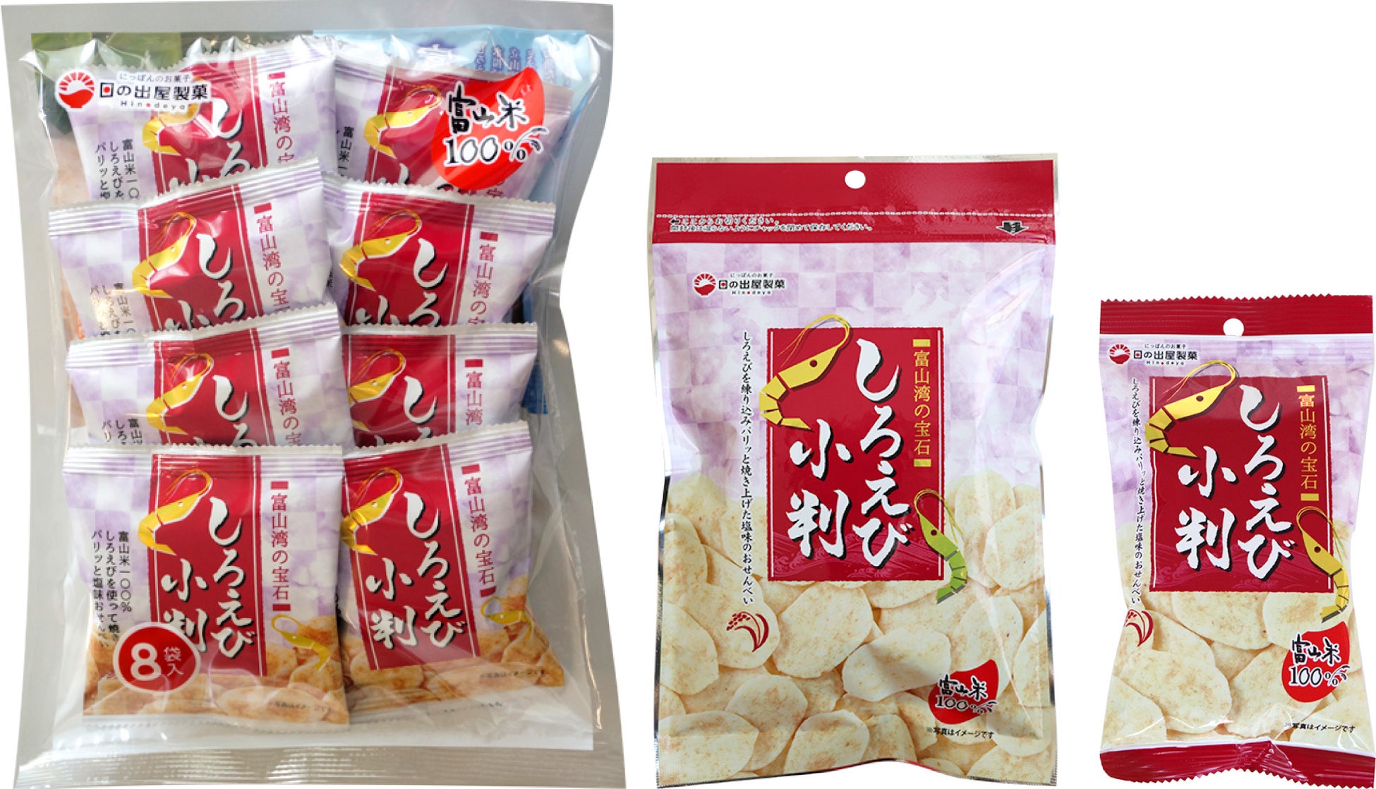 豊かな海が育んだ富山湾の宝石しろえびと富山県産米100%を使って香ばしく焼き上げた「しろえび小判」や、カリッとした歯ざわりともち米・昆布と旨みがおいしいサラダ塩味のあられの「こぶ柿」等、創業以来素材にこだわった米菓づくりに取り組み、ご自宅でのおやつや職場や地域の集まりなどの手土産などでご利用いただける商品を販売しています。