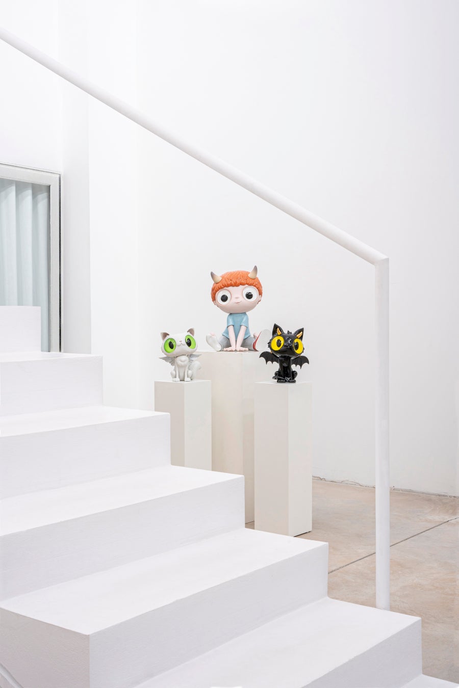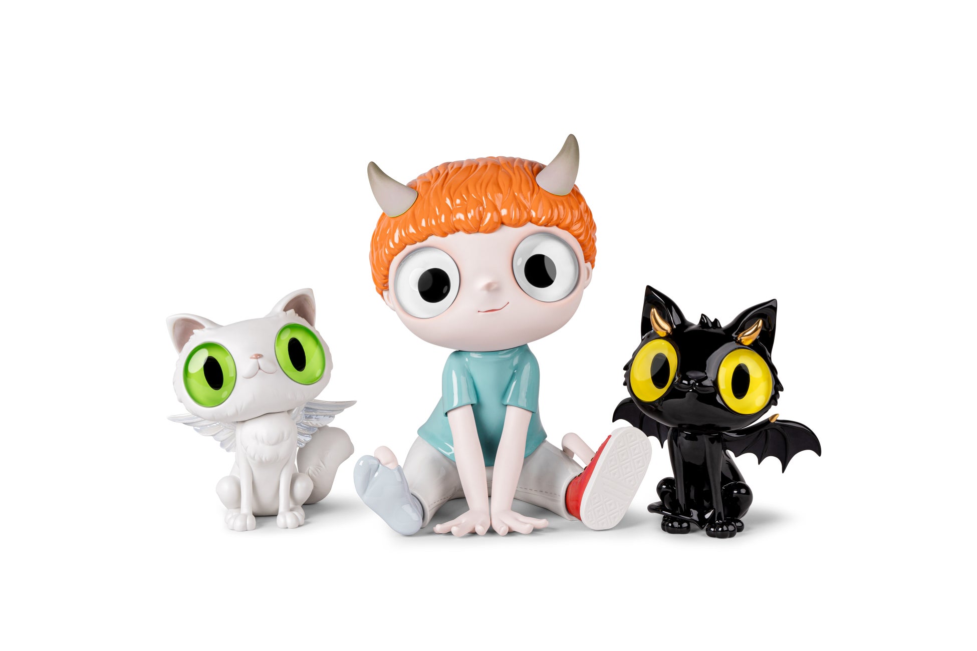 特に何かを目的とするのではなく、人々の感情を喚起することを目的としたこの作品は、鮮やかでカラフルな色彩で、人々の感情を呼び起こします。精巧な作りによって、丸い頭と大きな目を持つ「Boy」は無垢な魅力を伝えています。一方、「Devil Cat」はその名前にもかかわらず、邪悪に見えない姿がチャームポイントです。頭を少し傾け、大きな輝く黄色い目を持つその謎めいた姿が私たちの心をつかみます。「Angel Cat」は夢見がちな表情をしています。装飾の主な色はマットな白ですが、生き生きとした緑色の目と天使の羽がその性質を際立たせています。