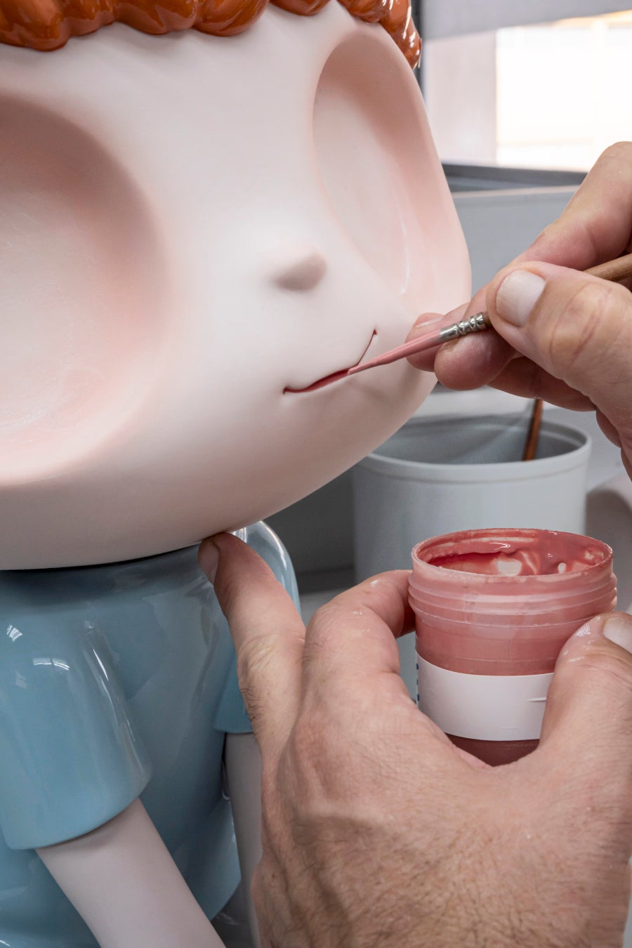 他のリヤドロの作品と同様「Art Editions」の作品も、リヤドロの拠点であるバレンシアの工房で最初から最後まで丹念な手作業で作られています。子どもの肌の色と猫の黒色の二つの特定の色が特別に作られ、全体的に温かみのある色調を目指しました。特に黒は赤みがかった色調を使用しています。作品はすべてリヤドロの制作チームが調合した4000色以上の色合いから、ハビア・カジェハ自身が選んだ、温かみのある強い色調で手書きされています。