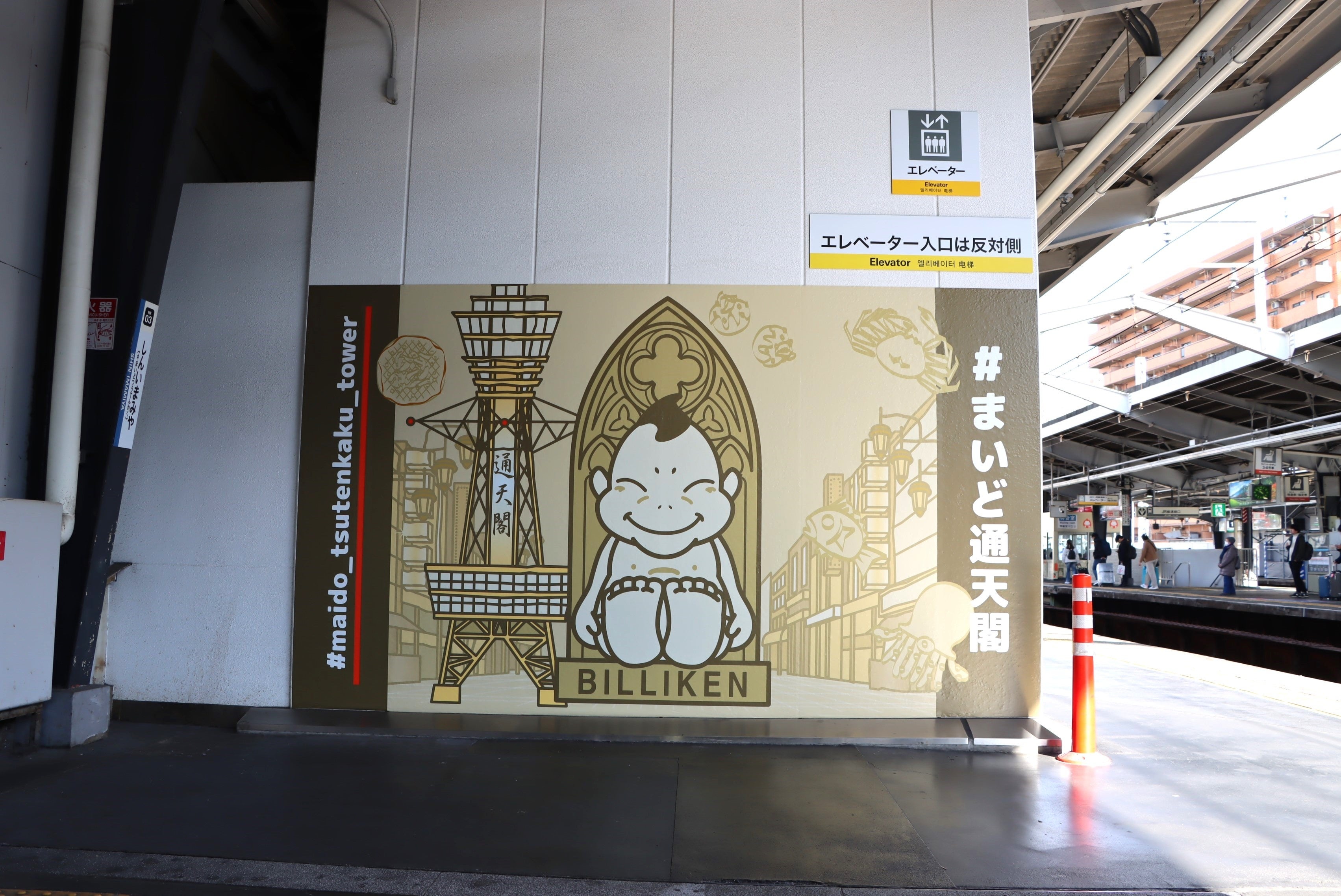 副駅名の導入に合わせ、駅名標等に「#まいど通天閣」を表示し、通天閣をモチーフにしたデザインに順次更新します。南海電鉄の通天閣最寄り駅として、駅構内を装飾し、通天閣へ向かうお客さまのワクワク感を醸成するほか、ホームから、通天閣へ続く出入口通路にはキャラクター「ビリケンだるま」※2による案内イラストを掲出し、通天閣を目的地とするお客さまが迷わず向かえるよう視覚的に案内します。