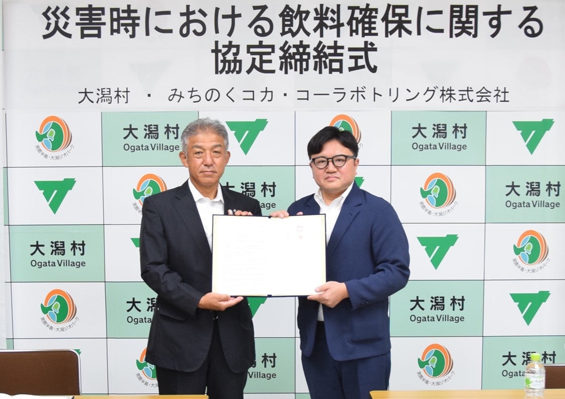 このたび、みちのくコカ・コーラボトリング株式会社(本社: 岩手県盛岡市、代表取締役社長: 谷村 広和)は、秋田県南秋田郡大潟村(村長: 髙橋 浩人)との間で、「災害時における飲料の確保に関する協定」を締結することとし、8月1日(月)に締結式を開催いたしました。