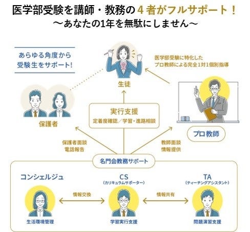 医学部受験に挑む受験生を、授業時間のみならず、自学自習・生活・メンタルなど あらゆる面から徹底サポートするのがMEDIC名門会です。選抜された正社員の「カリキュラムサポーター【CS】 <学習全般の実行支援>」は、「ティーチングアシスタント【TA】 <問題演習のサポート>」と「コンシェルジュ <生活環境やメンタルケア>」とともに“ONE TEAM” になって受験生を徹底的にサポートし、医学部合格へ導きます。