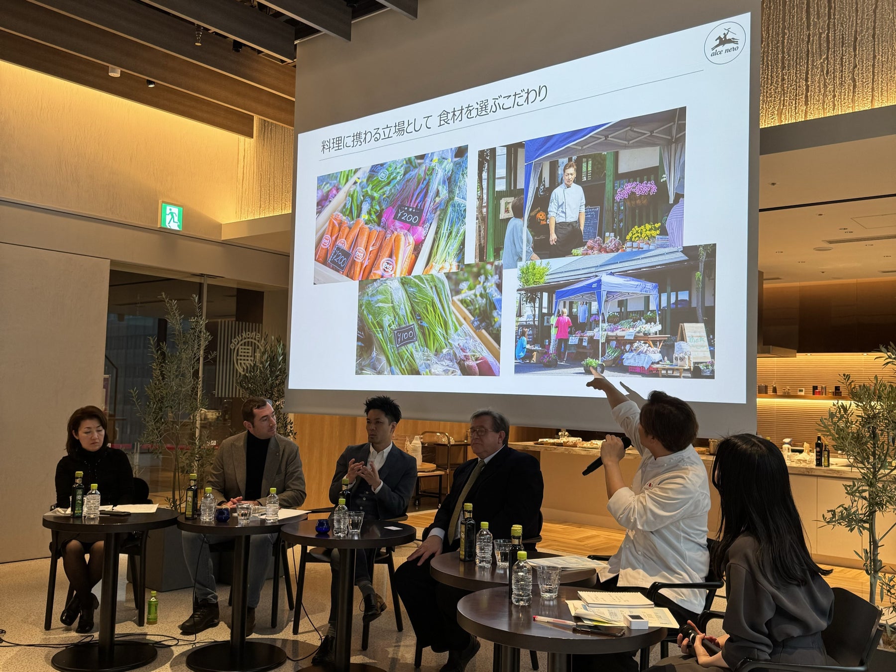 日仏貿易株式会社(本社:東京都千代田区 / 代表取締役社長 ギヨーム・カルー)は輸入販売するイタリアのオーガニック食品メーカー・アルチェネロの思いを伝えるため、「作る人と食べる人がつながる大切さ」をテーマにトークイベントを2024年3月12日(火)にMy Shokudo Hall&Kitchenにて開催しました。 アルチェネロ有機エキストラ・ヴァージン・オリーブオイルの生産者とYou Tubeで”Chef Ropia”としても活躍されているイタリアンシェフ 小林諭史さんが登壇し、それぞれの立場から「”食”を選ぶうえでのこだわり」について話し、そのこだわりが作る人と食べる人のつながりを生んでいること、お互いの思いを伝える大切さを気づくトークセッションとなりました。トーク後半は、生産者によるオリーブオイルの魅力を、オリーブ栽培を取り巻く環境やイタリア人にとってオリーブオイルがどんな存在なのかを交えながら語ってもらいました。 登壇者の熱い思いと会場で真剣なまなざしで聞いていた参加者約40名の様子が印象的であった本イベントの内容を紹介いたします。