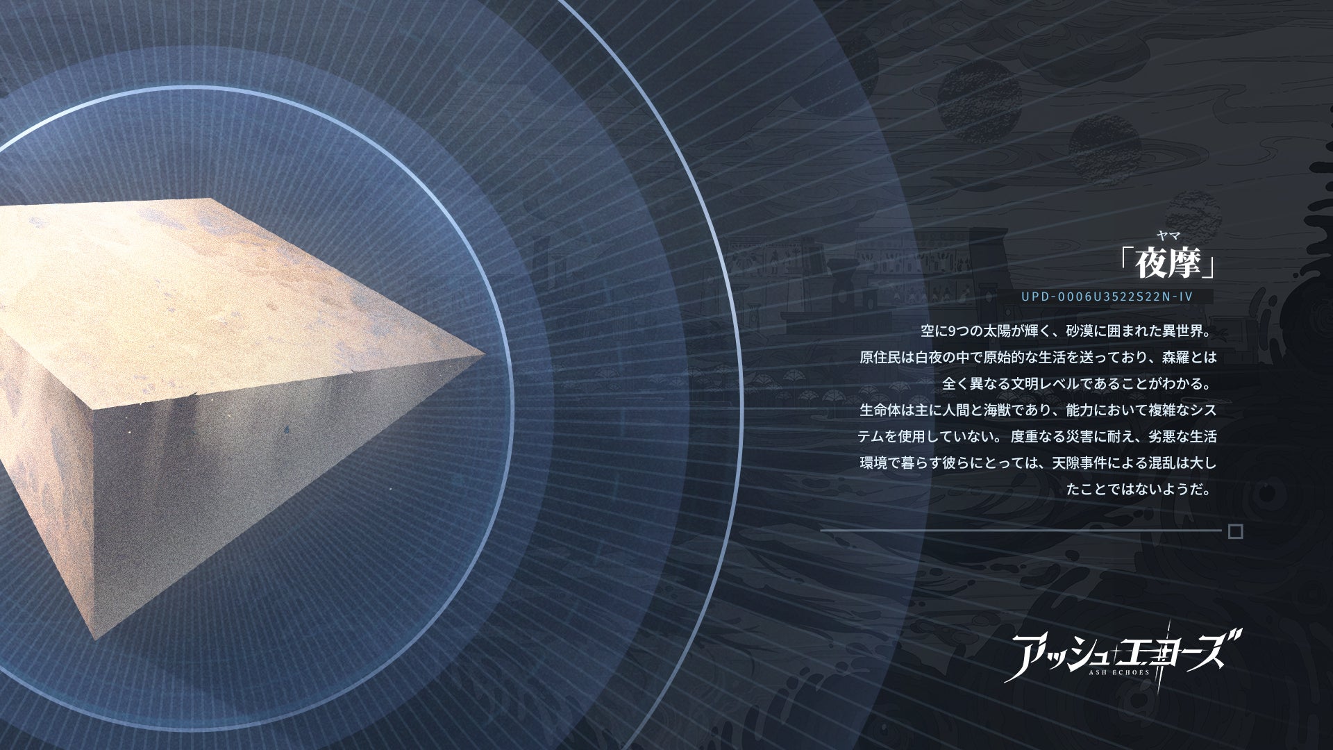 9つの太陽が輝く、砂漠に囲まれた異世界。白夜の中で、原始的な生活を送っている。干ばつが激しいため、主祭である一族が雨乞いを行う。今回発表されたPVでは、ワカーサという少女が神殿の司祭を務めていることが明らかになった。