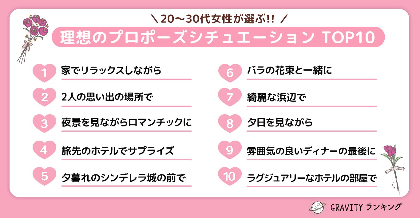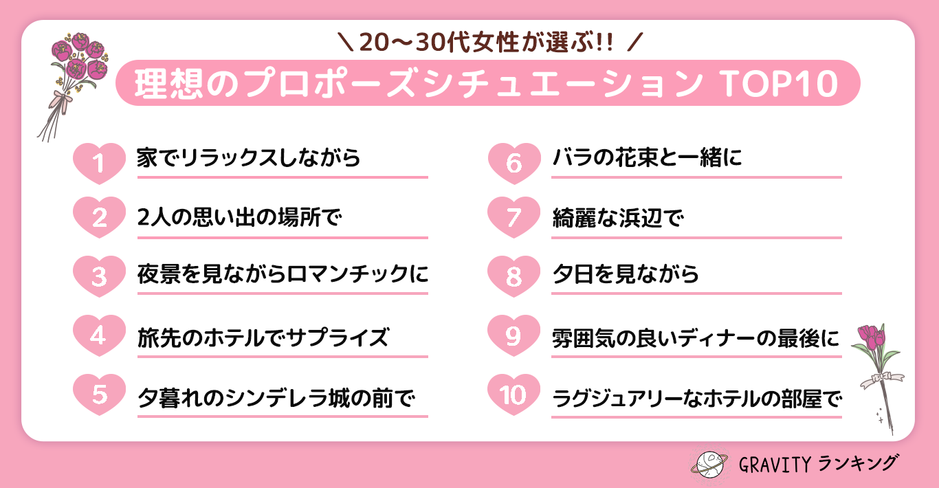 【GRAVITYランキング】20代〜30代女性が選ぶ!!「理想のプロポーズシチュエーションTOP10」
