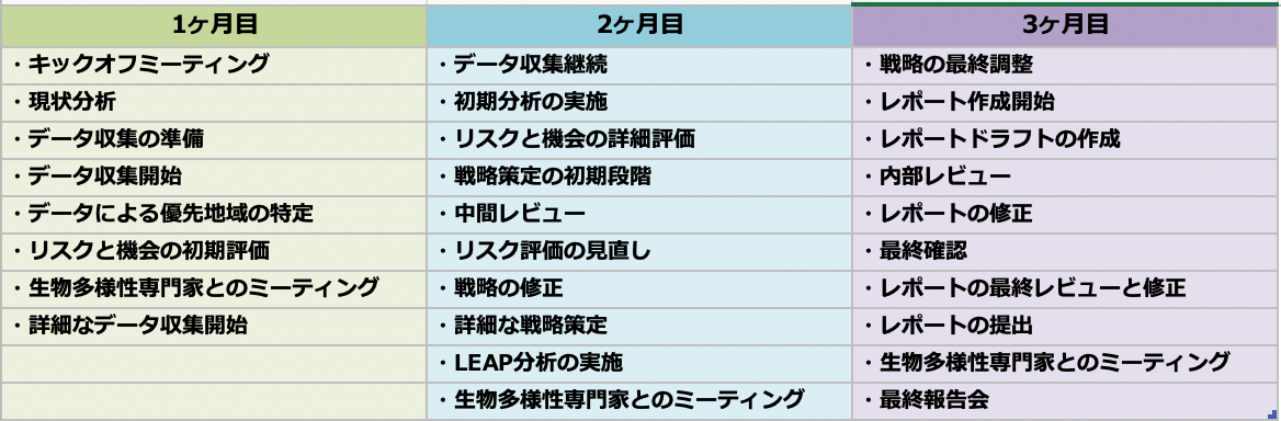 生物多様性の専門家と一緒に自社のリスクと機会を特定し、戦略を策定します。企業の自然資本、生物多様性リスクと機会の洗い出し、生物多様性リスクを含む総合的なリスク評価を行い、サポートします。