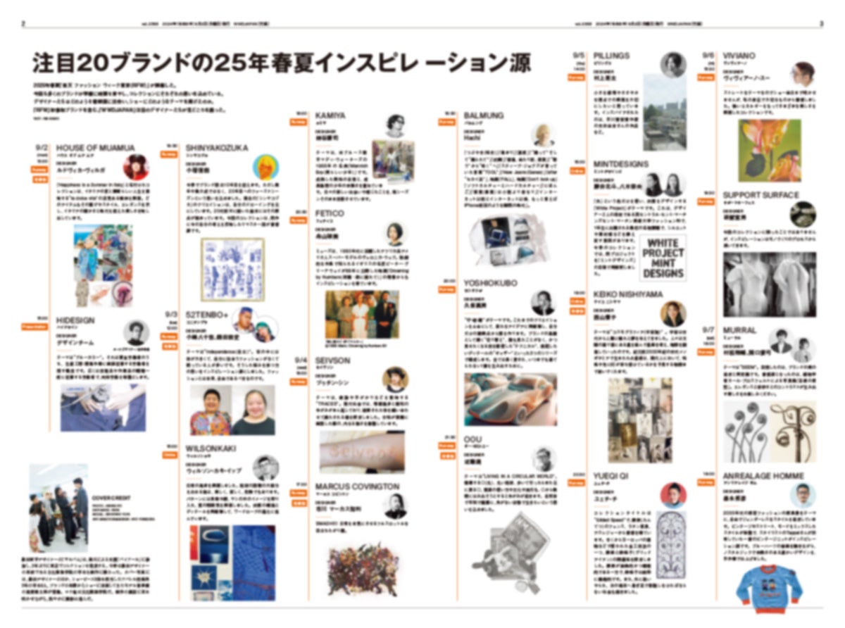 付録は「楽天 ファッション ウィーク東京」特別号です。2025年春夏シーズンの東コレが9月2日に始まります。「WWDJAPAN」は、東京のファッション・ウイークをさらに盛り上げるため、参加する20ブランドに今季のテーマやインスピレーション源を事前取材しました。ブランドのクリエイションの原点に立ち返るデザイナーから、ユニークなテーマを掲げるデザイナーまで、注目のラインアップです。