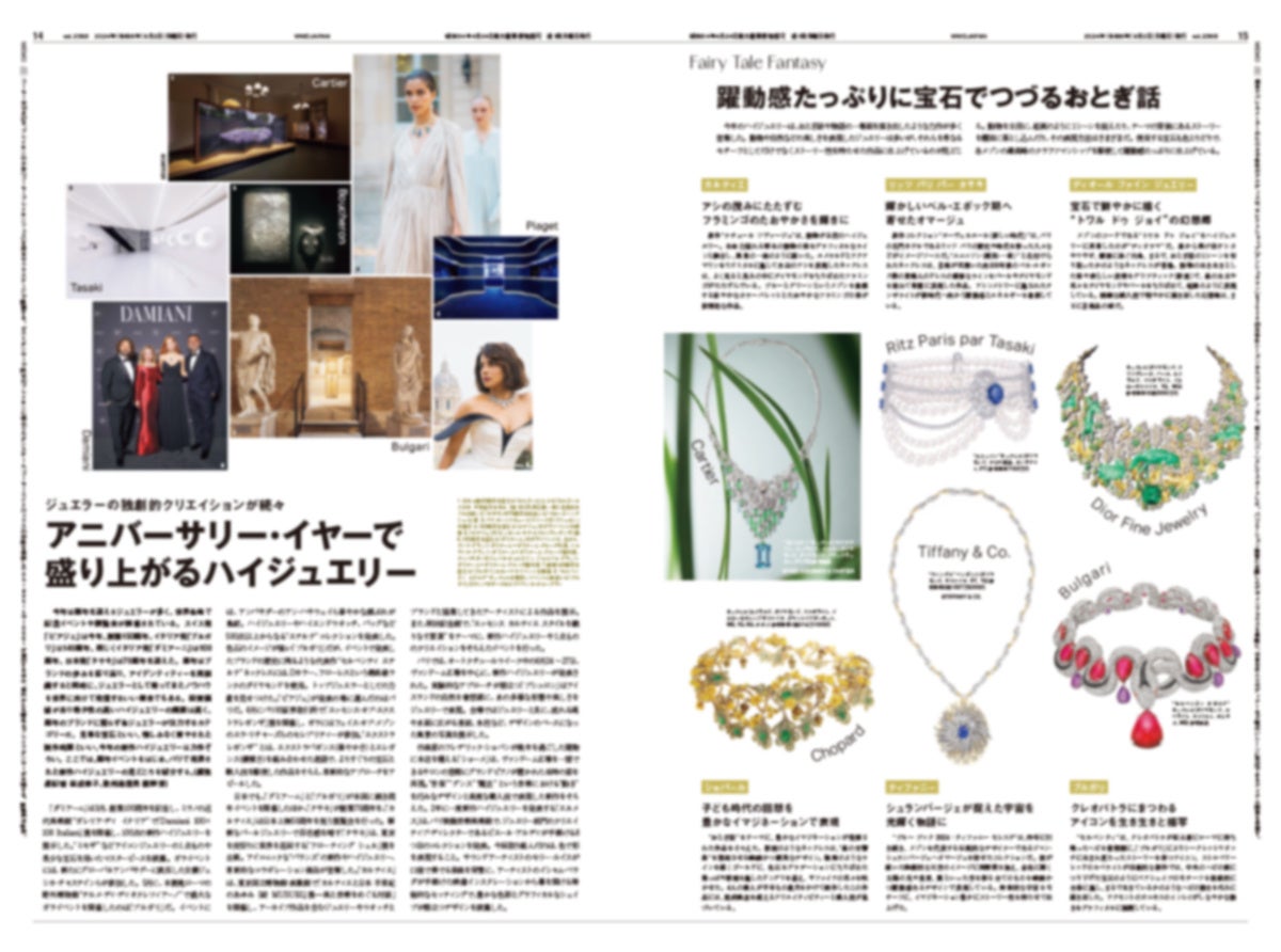 第2特集は「アニバーサリー・イヤーで盛り上がるハイジュエリー」です。きらびやかな高級ジュエリーの新作を一挙に紹介します。今年は「ピアジェ」「ブルガリ」「ダミアーニ」「タサキ」といった老舗ジュエラーが周年を迎え、例年以上に価値の高いネックレスやリングを制作しています。独創的なクリエイションは必見です。