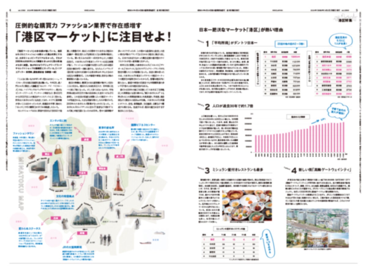 本特集では街づくりを担う森ビルや三井不動産、過去最高の売り上げを更新し続けるエストネーションやイセタンサローネ、「港区女子」を社会現象に押し上げた「東京カレンダー」など、港区のキーマンたちを取材し、日本で最も勢いのあるマーケットの実像を浮き彫りにします。またアートの街へ発展した港区について森美術館の片岡真実館長に解説してもらいました。
