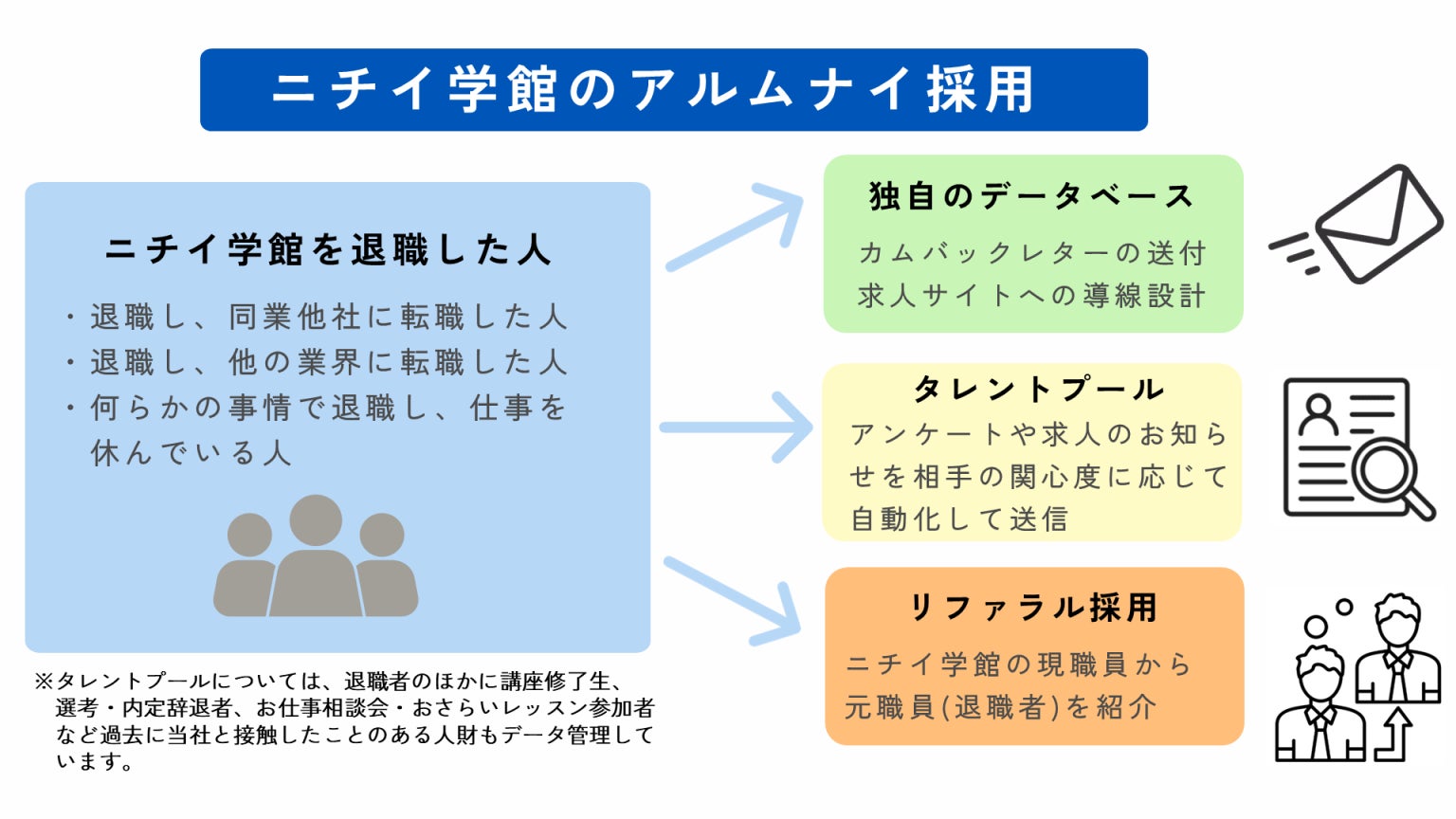 その中でも過去に当社に就業したことのある元職員の復職を促す「アルムナイ採用」は、従来から重視しており、カムバックレターの送付や当社求人サイトへの誘導などの施策に加え、「カムバック制度」など復帰しやすい制度設置なども行ってきました。2022年からは外部のプラットフォームを導入し退職者への接触を自動化することで、更なる効果を狙っています。