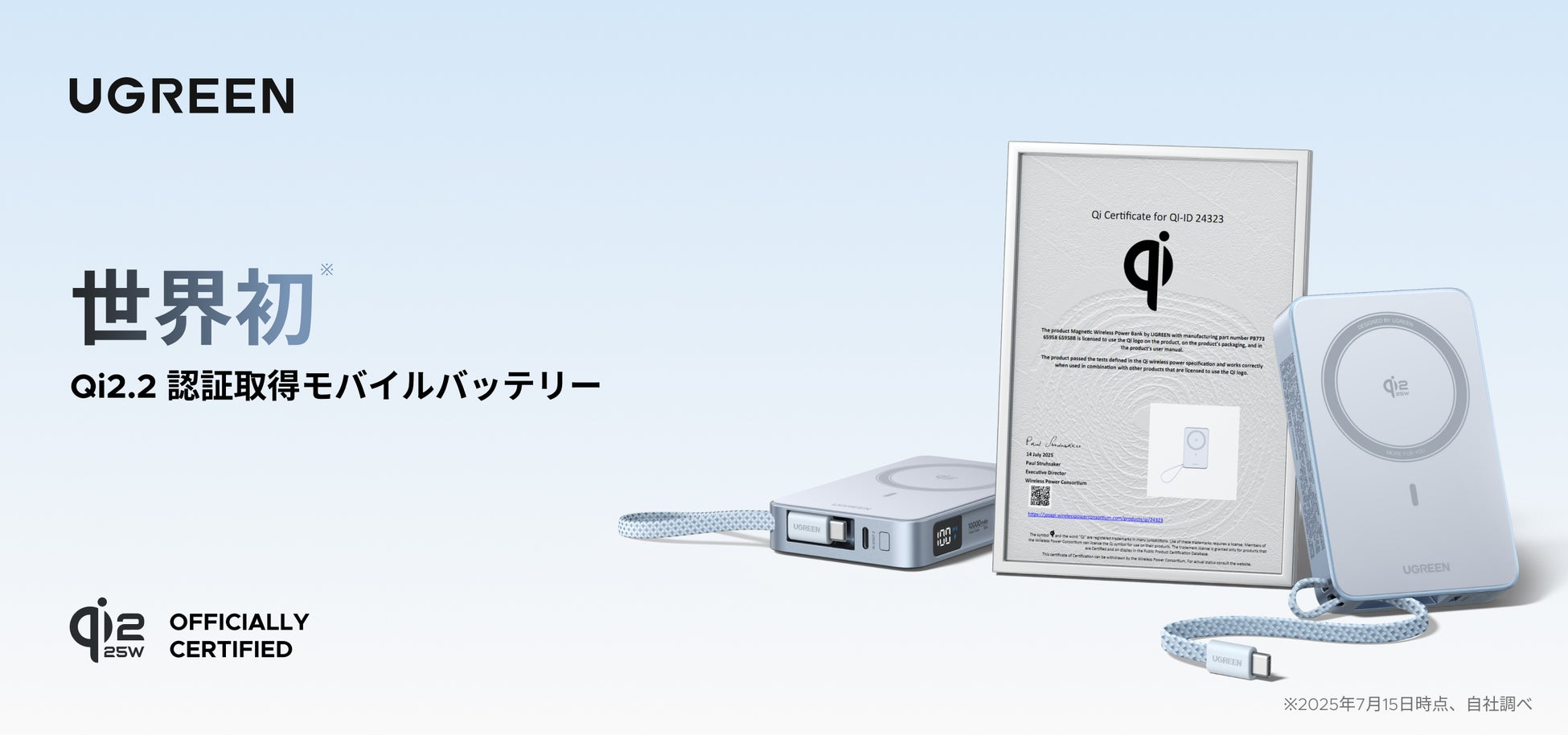 最先端の技術を採用して信頼性の高いPCやスマートフォン周辺機器などを開発・生産している株式会社ユーグリーン・ジャパン (本社:東京都千代田区 ) は、同社の次期製品「MagFlow マグネット式モバイルバッテリー」が、世界で初めて(※)ワイヤレスパワーコンソーシアム(WPC)よりQi 2.2の正式認証を取得したことを発表しました。(※2025年7月15日時点、自社調べ)