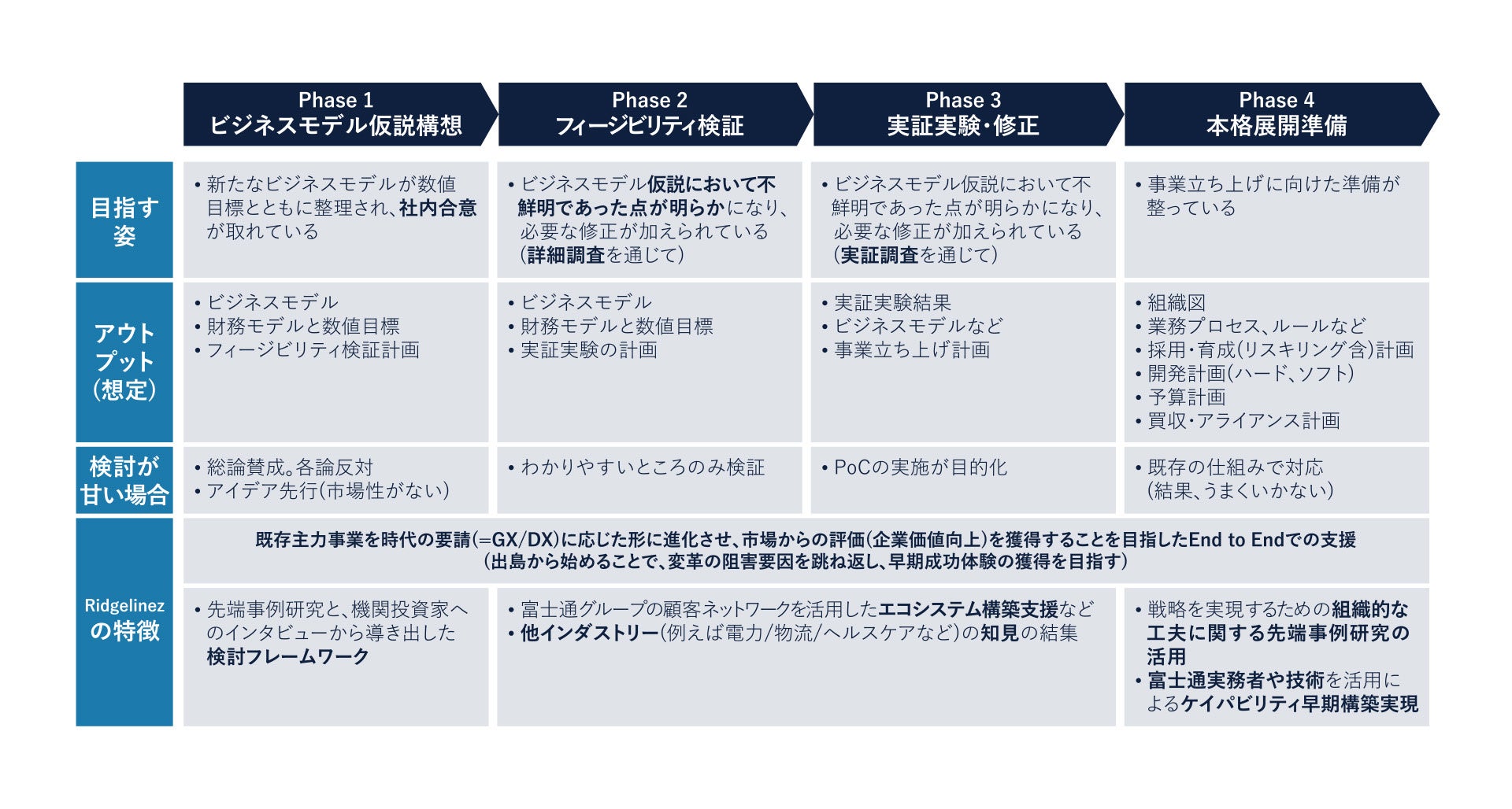 本サービスは、新たなビジネスモデルの構想から事業立ち上げまでを、ビジネスモデル仮説構想、フィージビリティ検証、実証実験、本格展開の4つのフェーズで支援します。