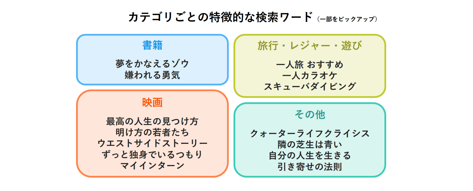 「クォーターライフ・クライシス」に直面する人々は、書籍や映画に刺激を受けることや、「一人旅」「一人カラオケ」のように自分だけの時間を過ごすことを検討していることが分かりました。また「隣の芝生は青い」「自分の人生を生きる」などの検索も特徴的であり、"人と比べない"という考えにたどり着きやすいことがうかがえます。