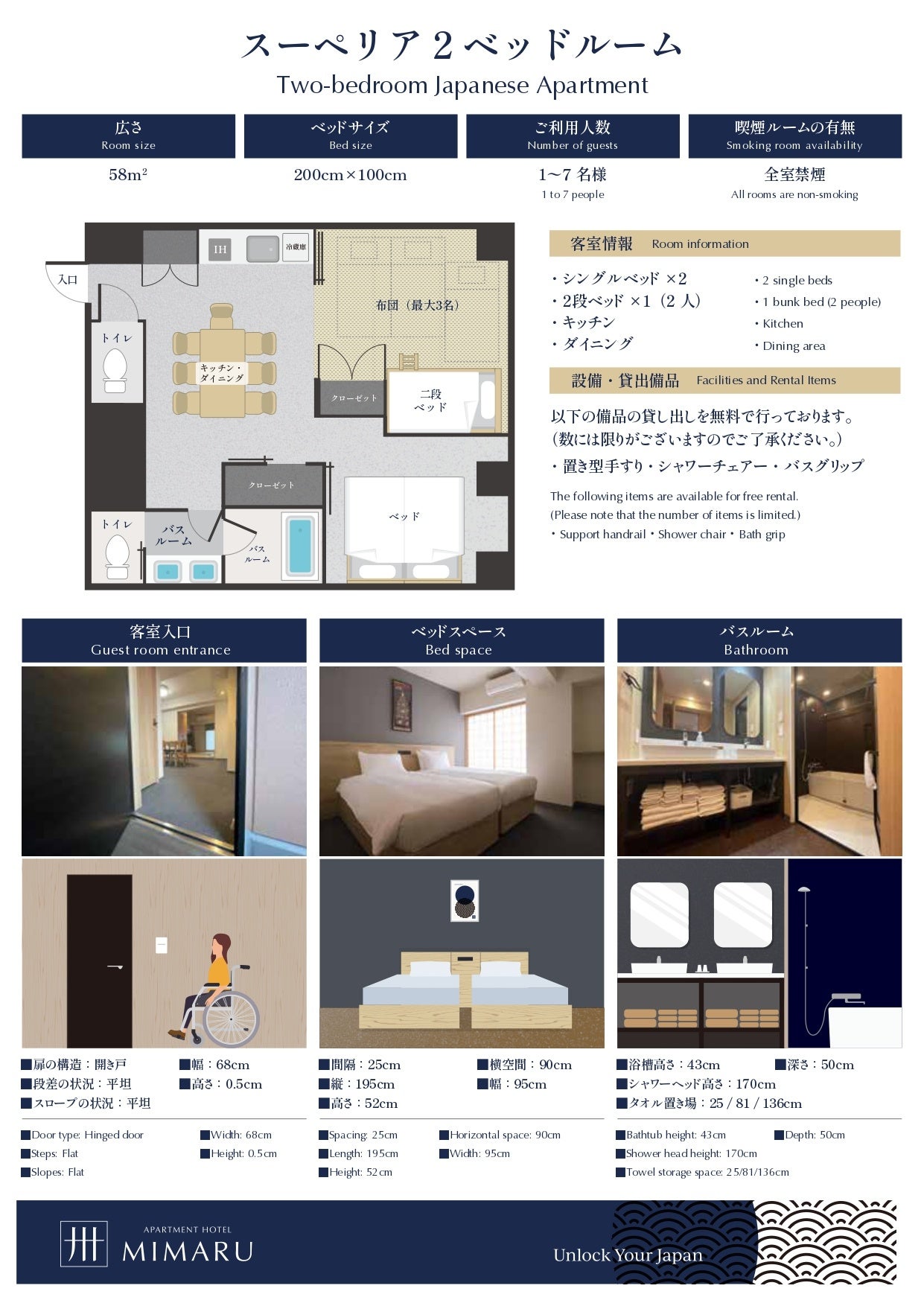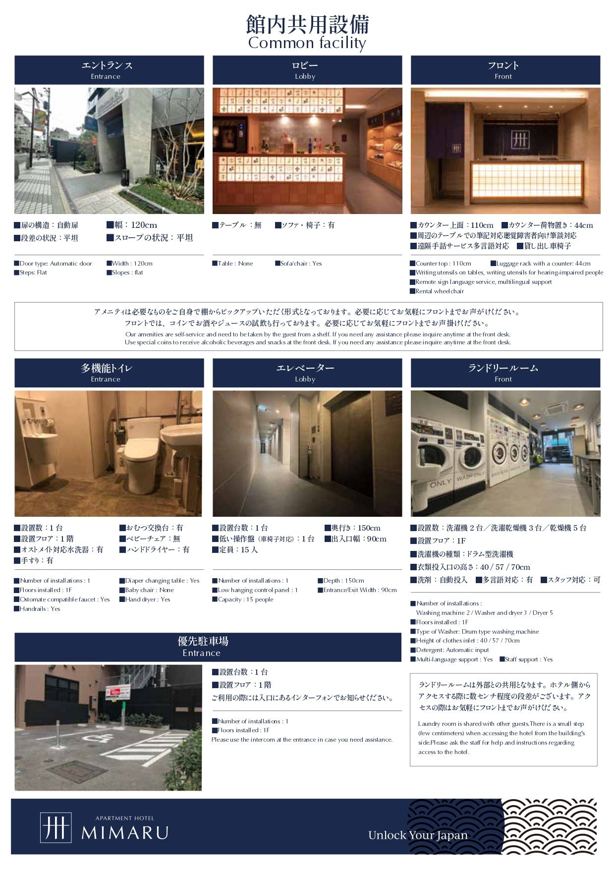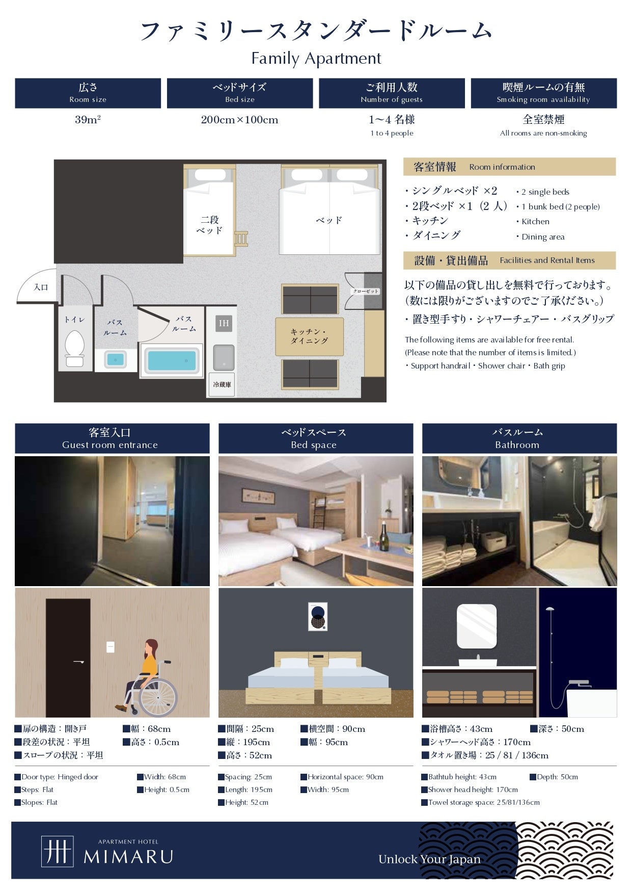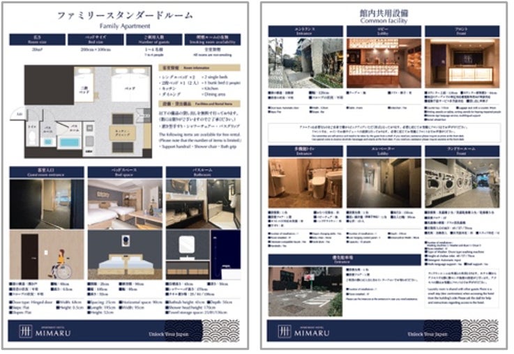 障がいのある方は、宿泊場所について事前の情報収集にとても苦労されているという声を聞くことがあります。「MIMARU大阪 心斎橋EAST」では、車いすを利用さる方の目線で共用設備と一部客室タイプの詳細案内を用意しました。車椅子が通れる幅であるか、車椅子から移る際に移動しやすい高さかどうかなどを、写真、イラスト、寸法、レイアウトで紹介。宿泊前に施設内の状況を確認することができ、安心してご利用いただけるようにしました。順次、全施設で採用していきます。