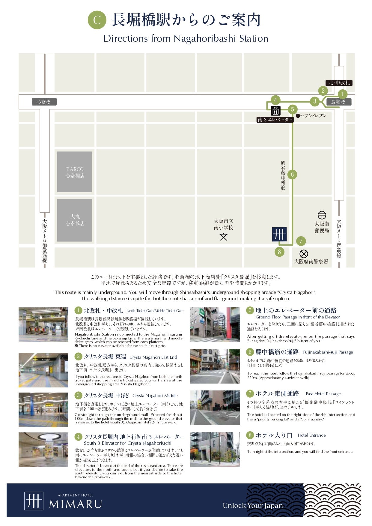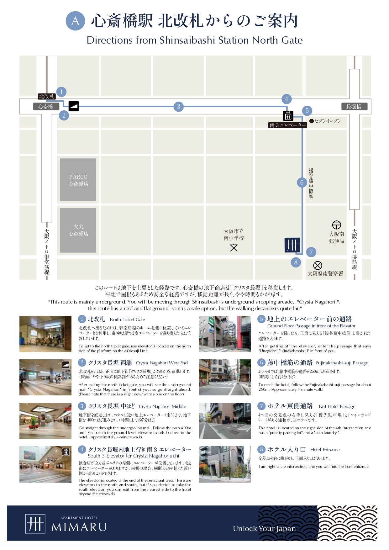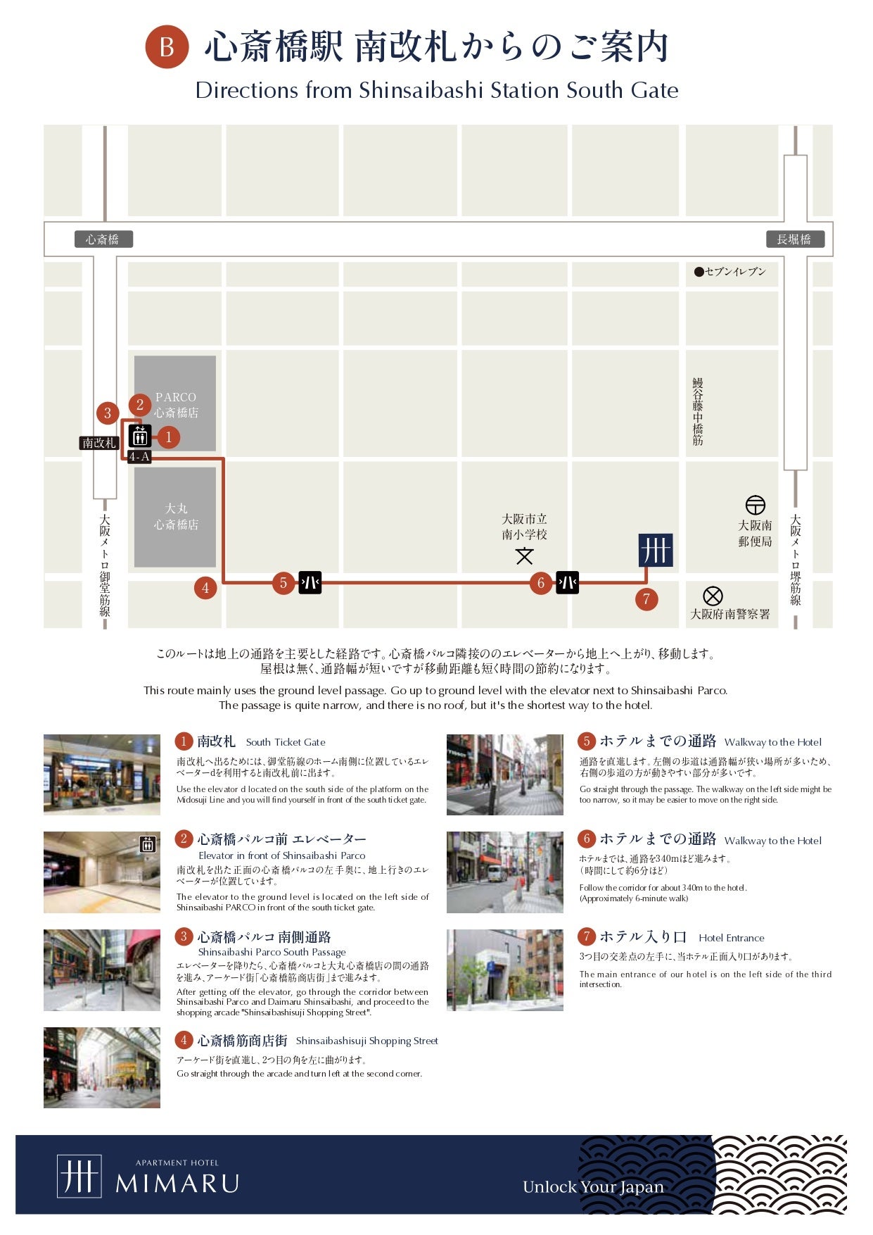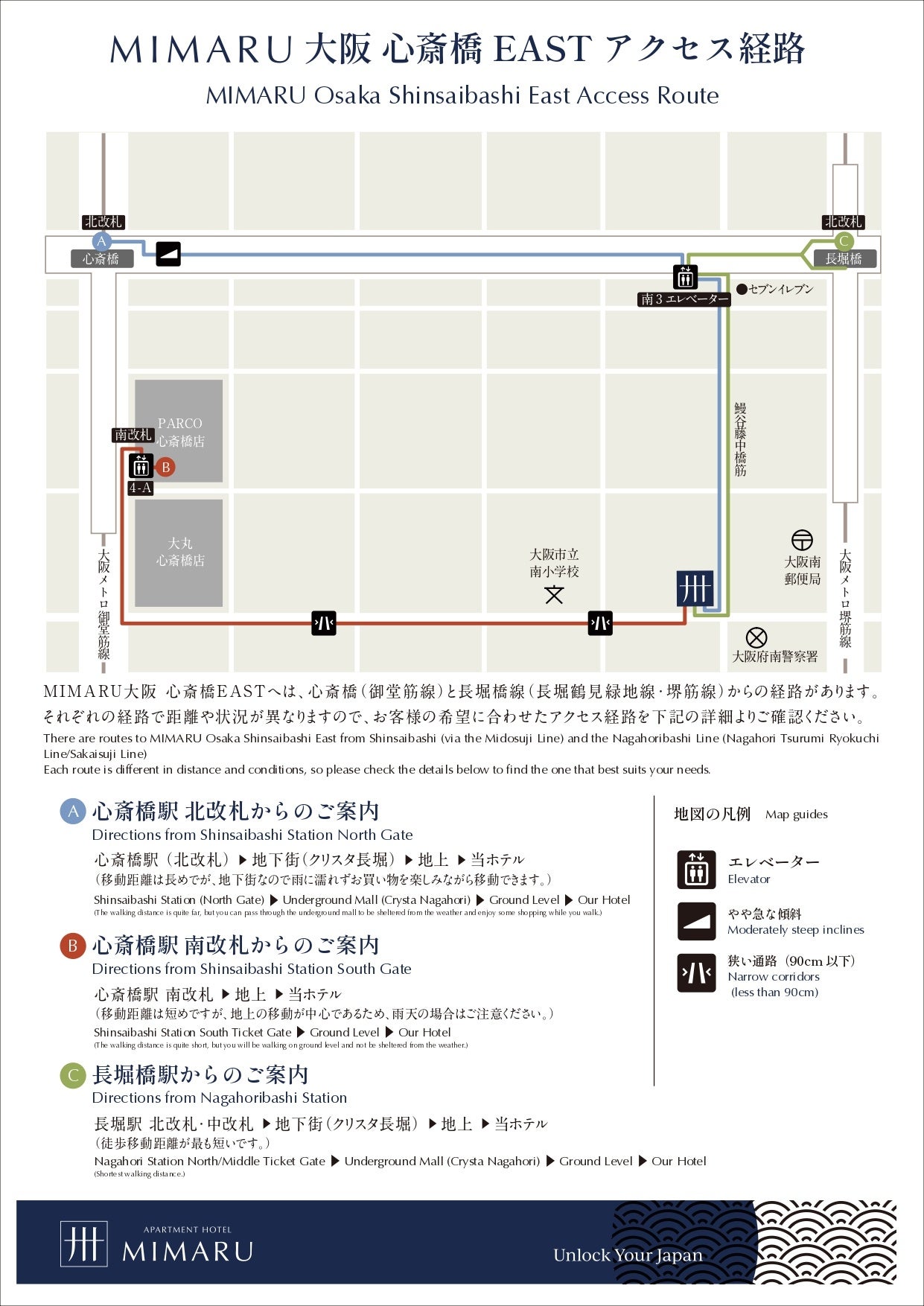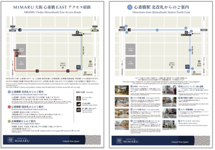 「MIMARU大阪 心斎橋EAST」にて最寄り駅からMIMARUまでのルートを障がいのある方の視点で確認し、アクセスマップを作成しました。道路の平坦さや通路幅など「移動のしやすさ」「移動距離」「雨にぬれずに移動できるか」などの観点を組み合わせて、3とおりのルートを説明。写真を添え、弱視の方にも視認しやすい色を採用しています。このアクセスマップは、車椅子の方のみならず、大きい荷物を持って来日する海外ゲストやベビーカーを利用するご家族、高齢者にも有益な情報であるため、順次、全施設のアクセスマップを用意していきます。