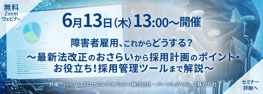 法人企業向け障害者雇用オンラインセミナー「障害者雇用、これからどうする?~最新法改正のおさらいから採用計画のポイント・お役立ち!採用管理ツールまで解説~」6月13日(木)13:00~開催